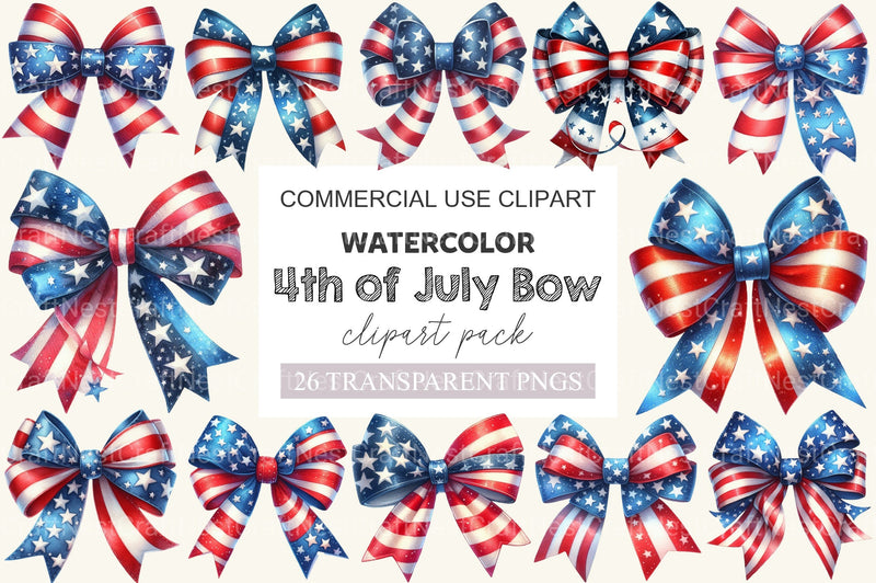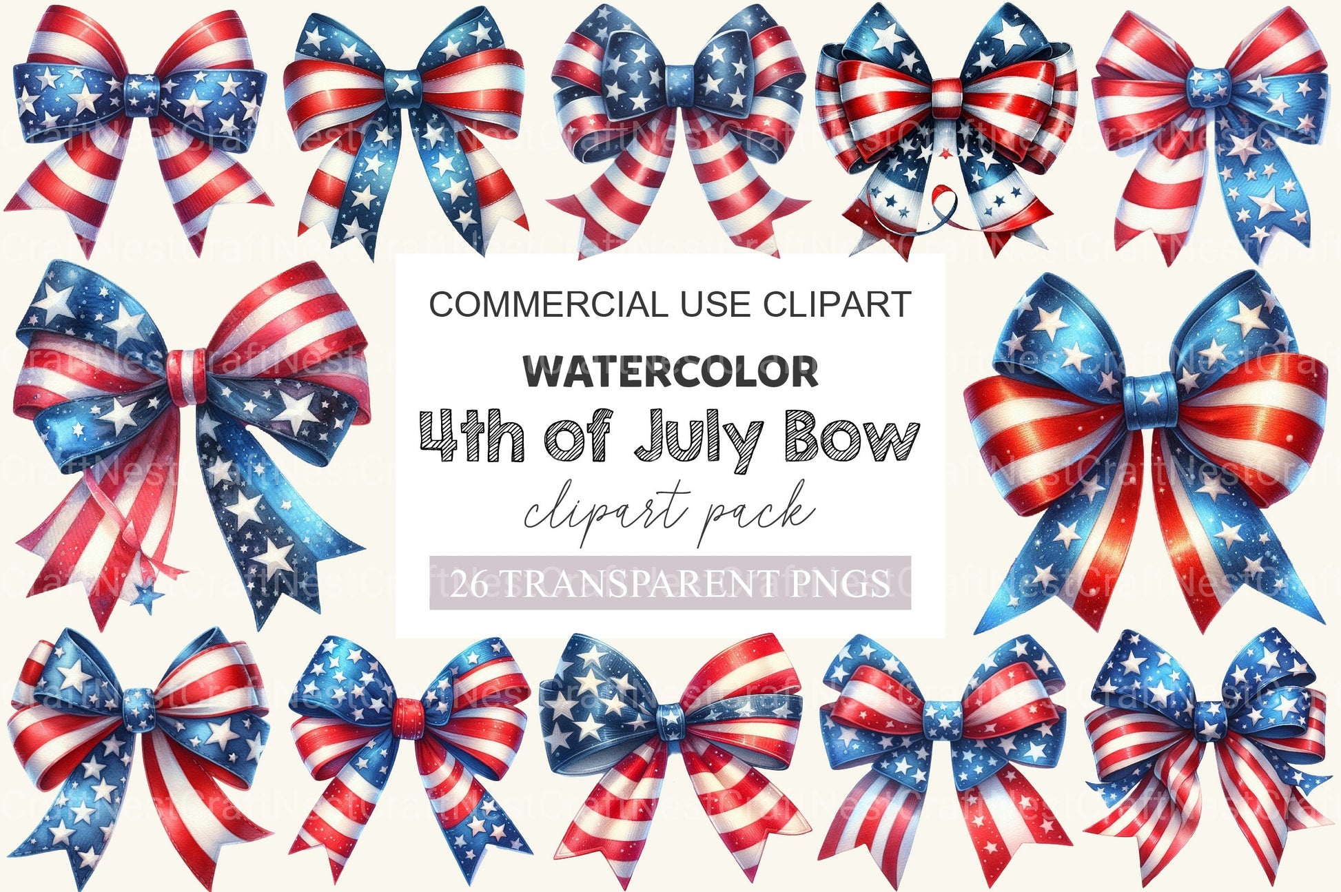 Style with this 4th Of July Bow Clipart Bundle, featuring patriotic bow designs, ideal for Independence Day fashion crafts.