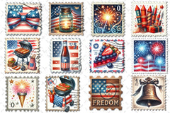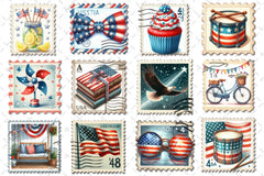 Patriotic postage stamp designs for Independence Day mail projects.