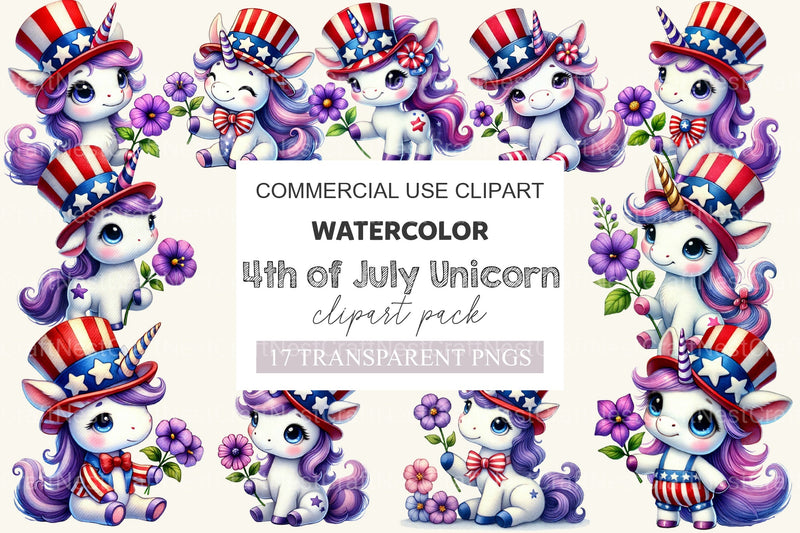 Sparkle with this 4th Of July Unicorn Clipart Bundle, featuring patriotic unicorn designs, perfect for magical American crafts.