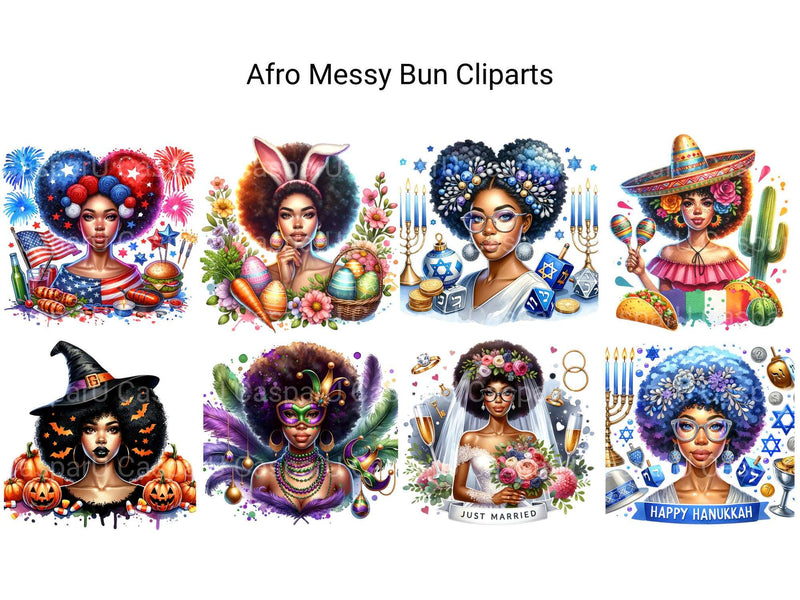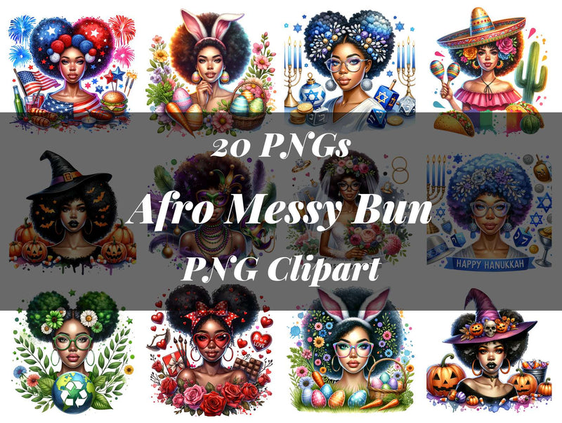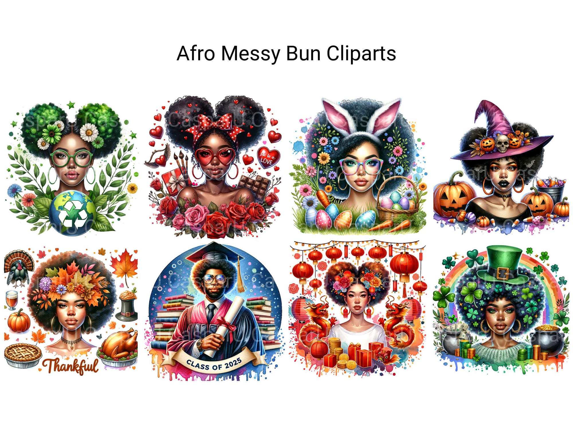 Rock the style with this Afro Messy Bun Clipart set, featuring chic hair designs, ideal for cultural and fashion projects.