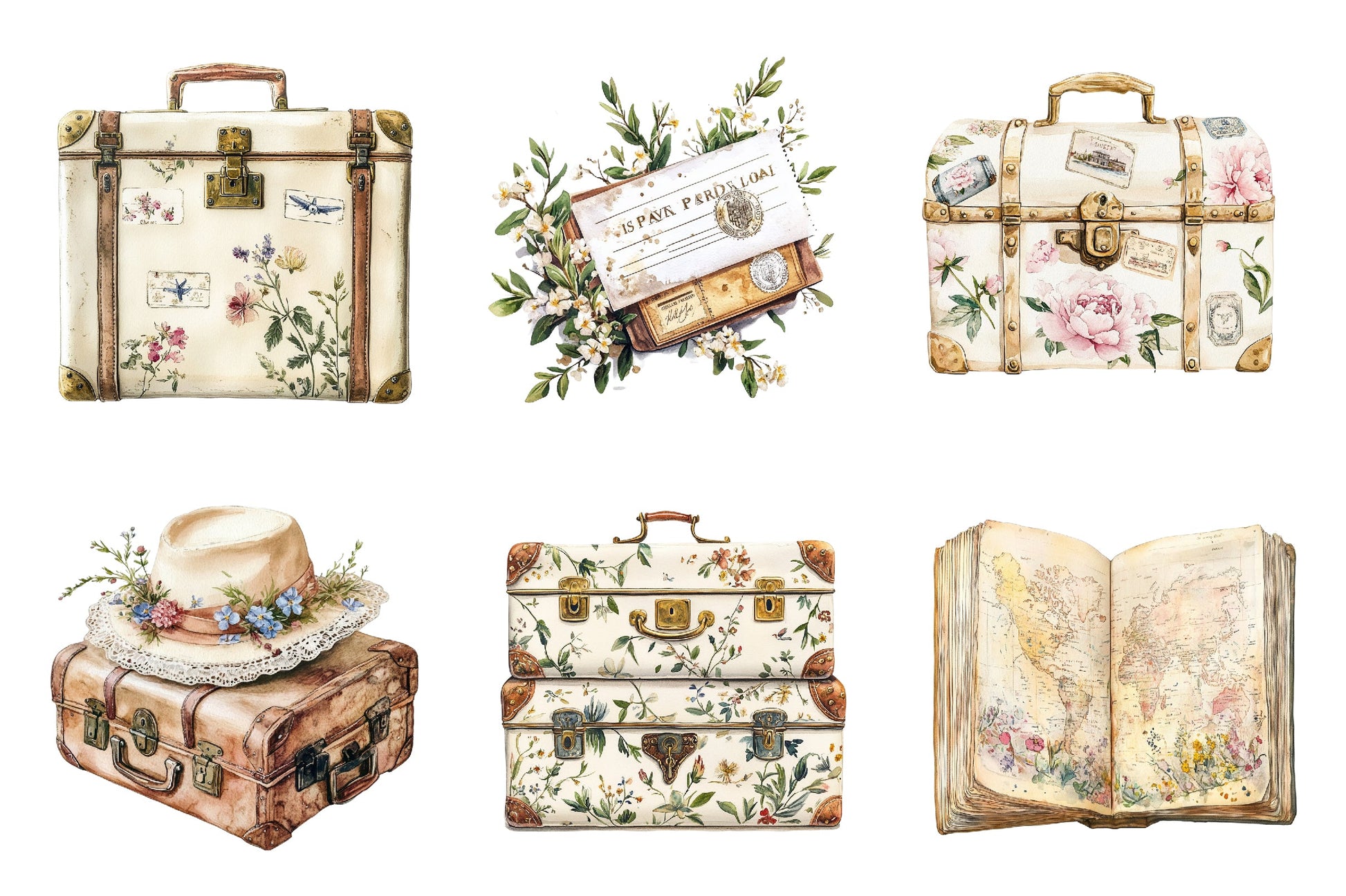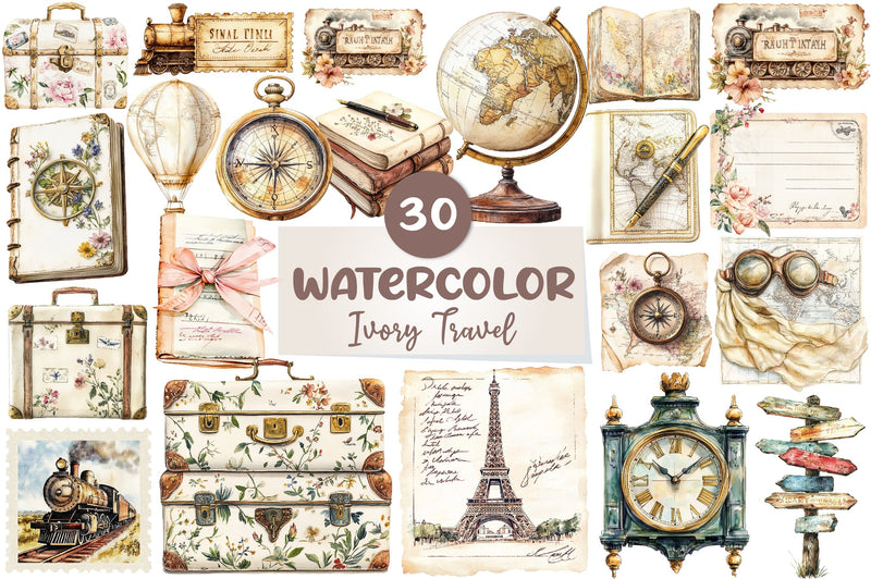 Journey with this Antique Ivory Travel Clipart Bundle, featuring vintage travel designs, ideal for wanderlust crafts.