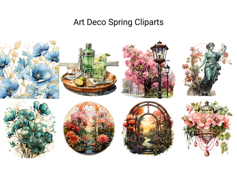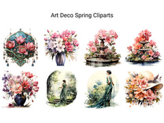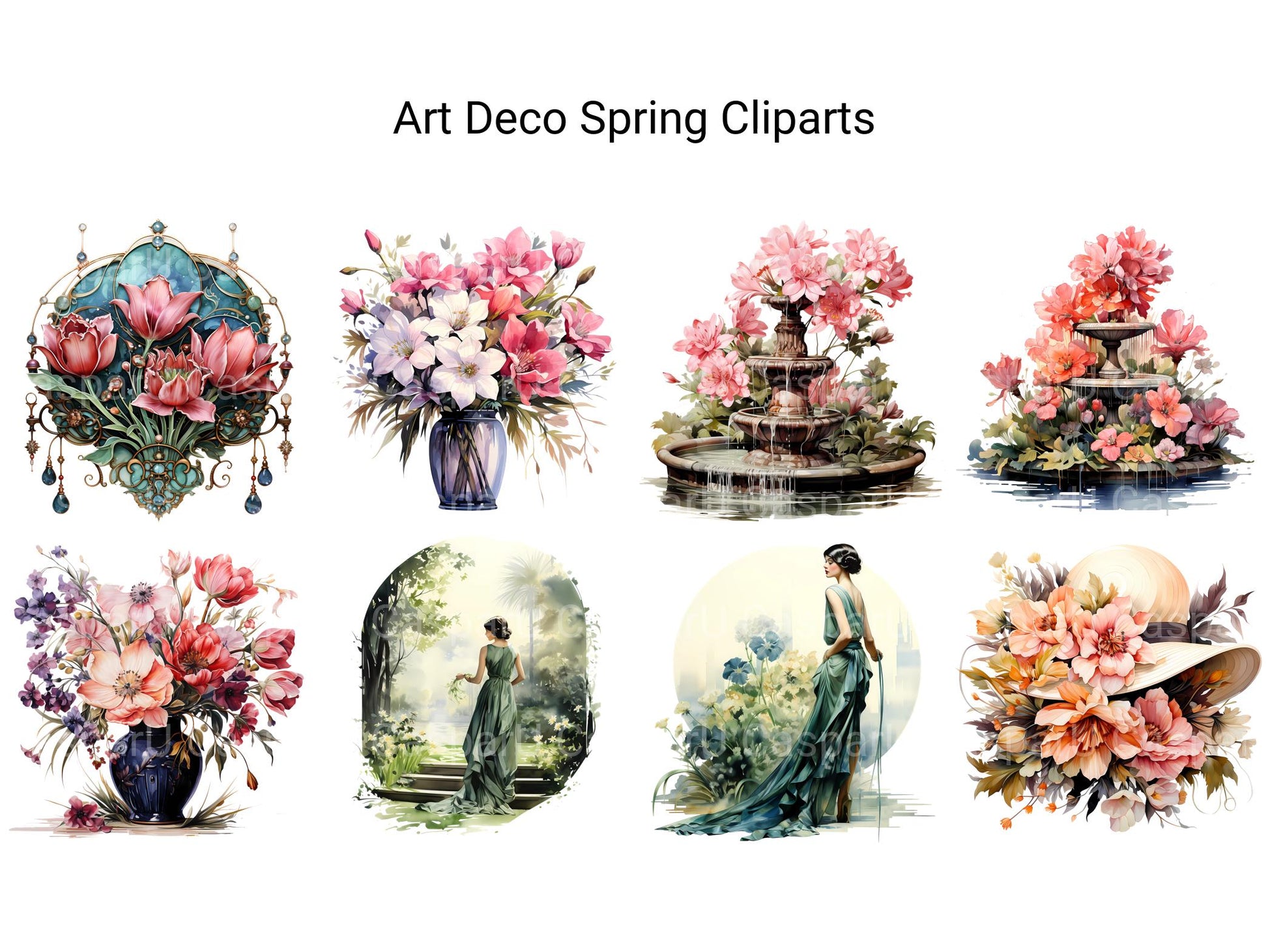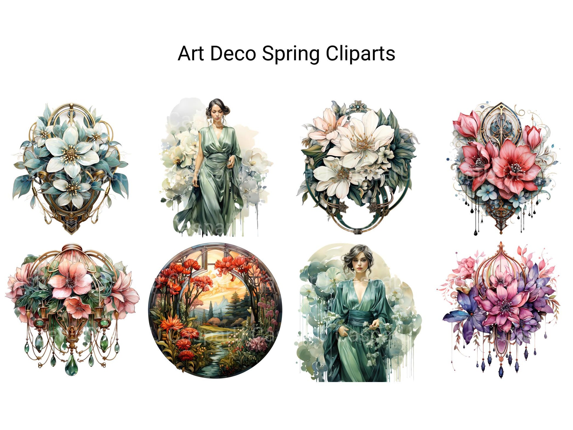 Step into the glamour and sophistication of Art Deco Spring with digital clip art featuring elegant and geometric designs inspired by the Roaring Twenties. From sleek lines to luxurious motifs, these stunning images capture the essence of Art Deco style, perfect for adding a touch of vintage flair to your spring projects. Let the opulence of Art Deco Spring transport you to a world of timeless elegance and Gatsby-inspired beauty.