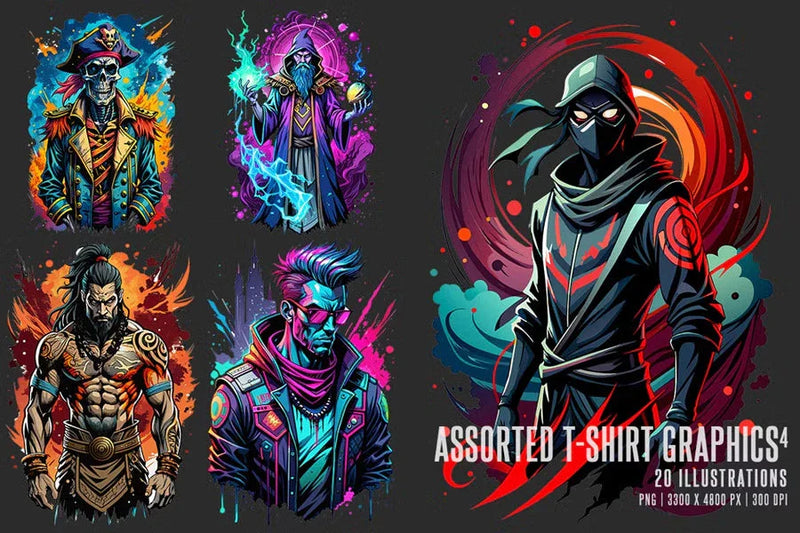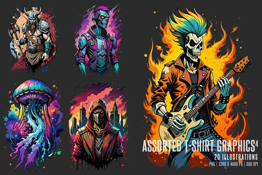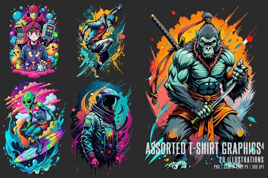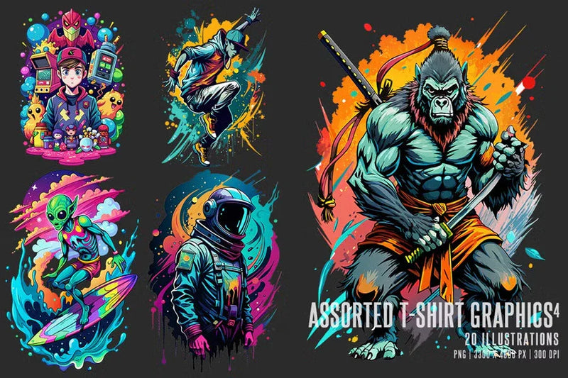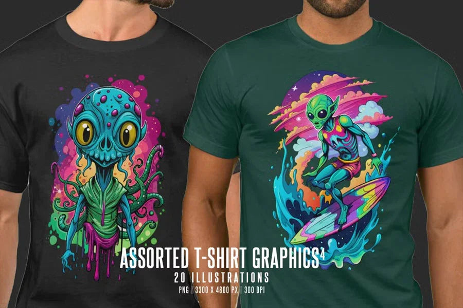 Unleash your style with Assorted T-Shirt Graphics V4 - Funky & Groovy, featuring vibrant and unique designs perfect for making a bold statement. Ideal for fashion enthusiasts looking to add a touch of creativity to their wardrobe.