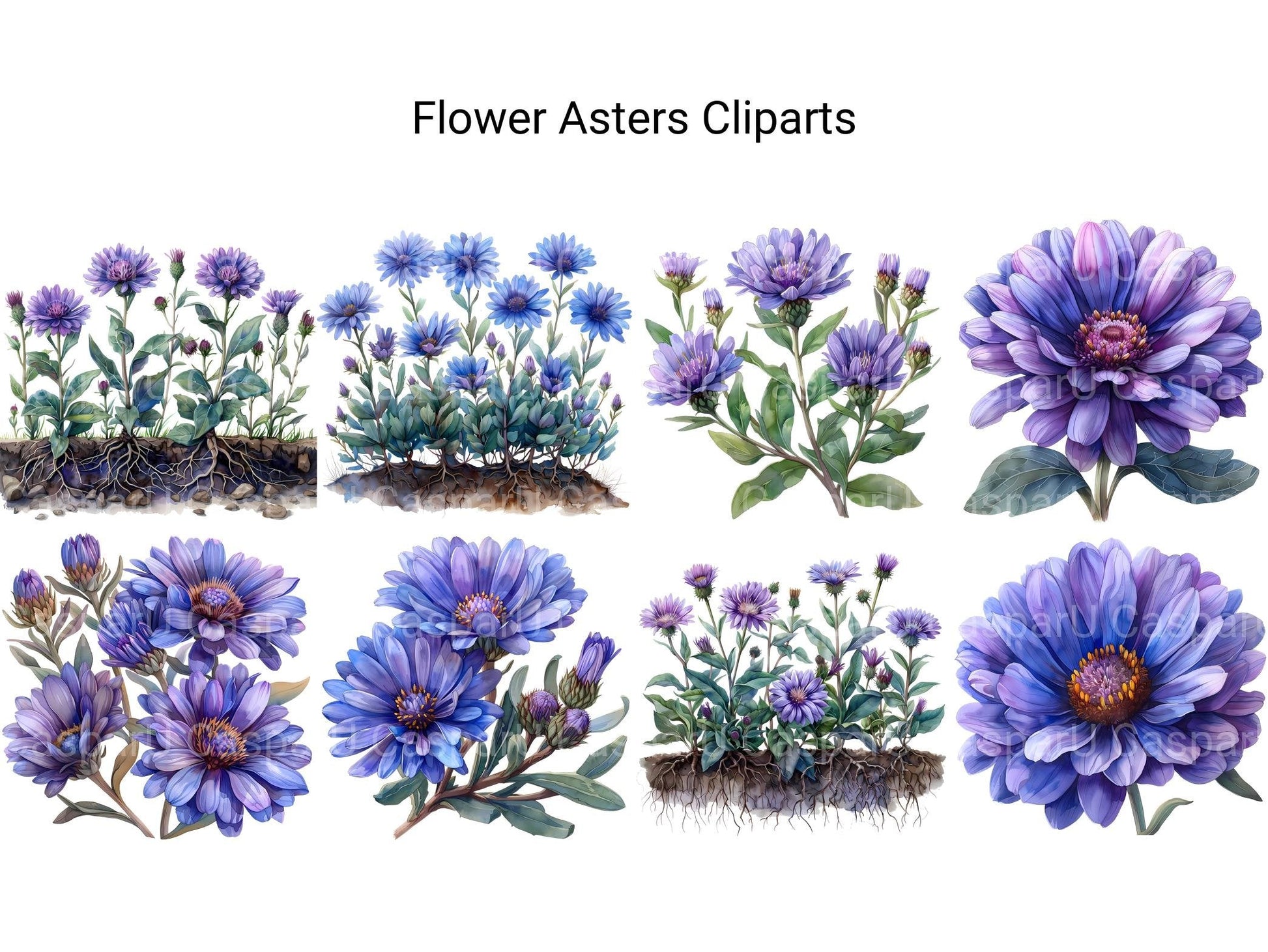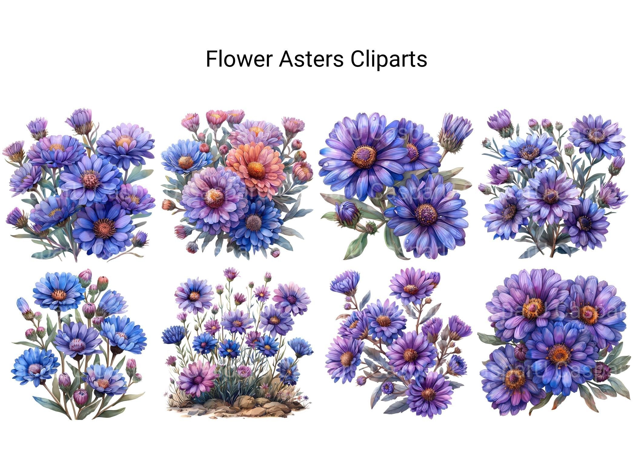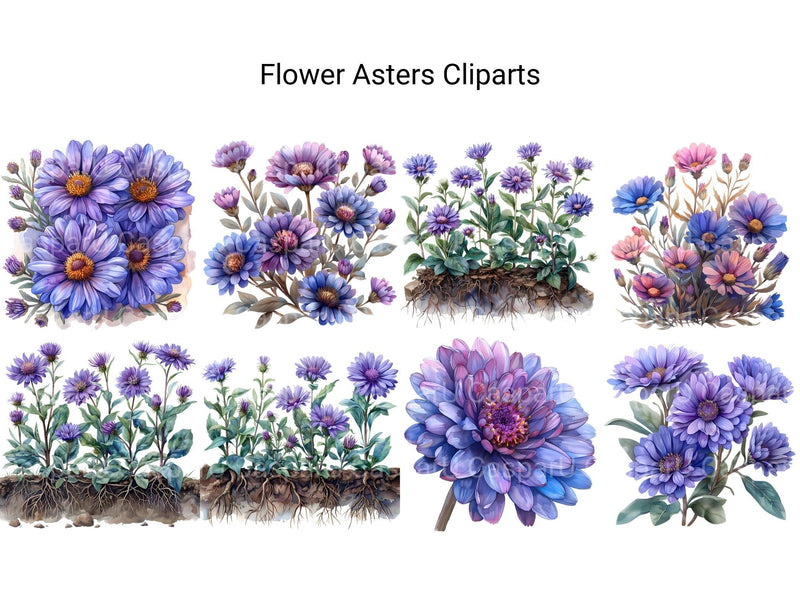 Delve into our collection of digital cliparts showcasing the ethereal beauty of asters flowers. These charming cliparts capture the grace and delicacy of asters, making them perfect for enhancing your digital designs, scrapbooks, and invitations with a touch of natural elegance. Each clipart is meticulously crafted to highlight the unique details and vibrant colors of these lovely blooms.