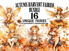 Celebrate the bounty of the season with our Autumn Harvest Fairies clip art. These cozy digital illustrations depict fairies amidst golden leaves, ripe fruits, and pumpkins, capturing the warmth and abundance of autumn harvests, perfect for adding a touch of seasonal charm and nostalgia to your creative projects.