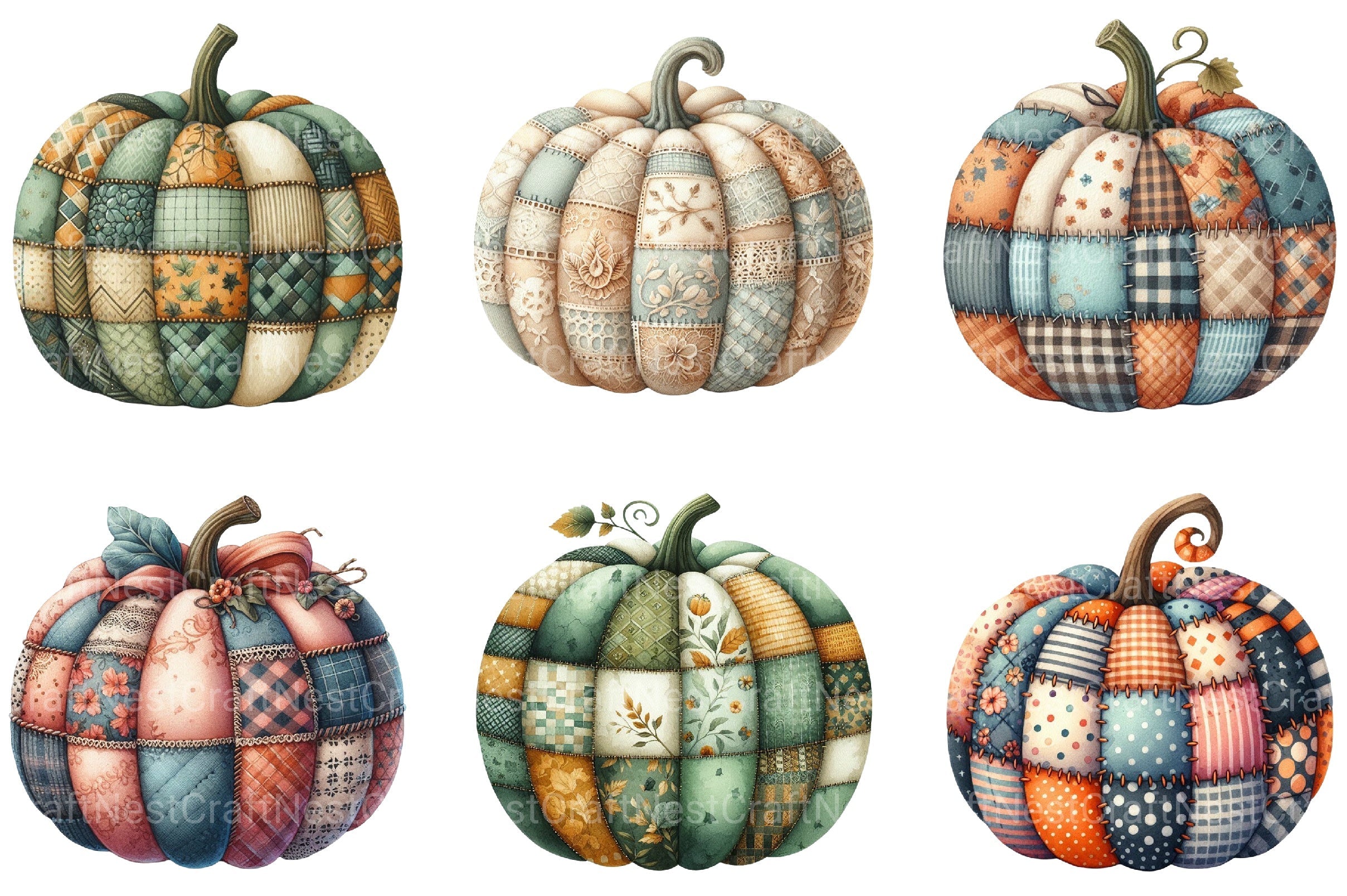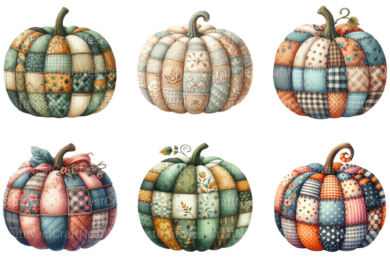 Harvest with this Autumn Patchwork Pumpkin Clipart Bundle, featuring pumpkin designs, perfect for fall crafts.