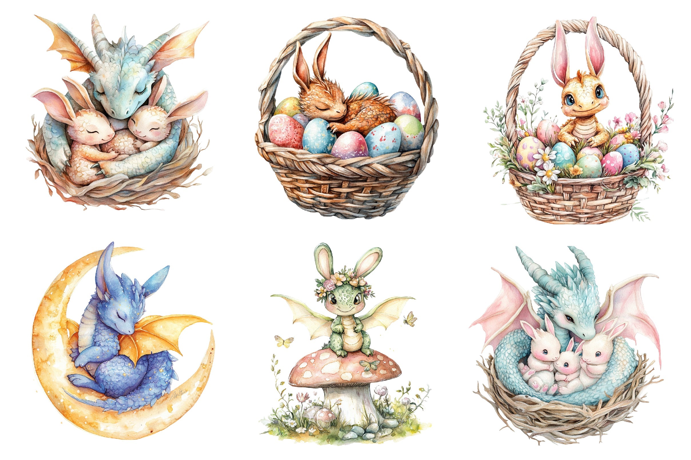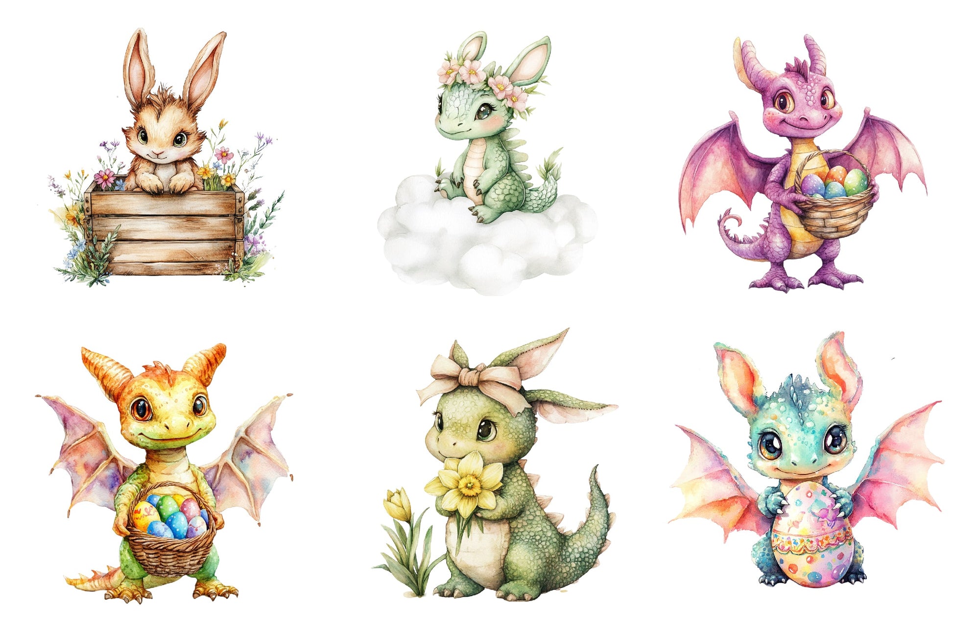 Hop with this Baby Dragon With Bunny Ears Clipart Bundle, featuring Easter dragon designs, ideal for fantasy holiday crafts.