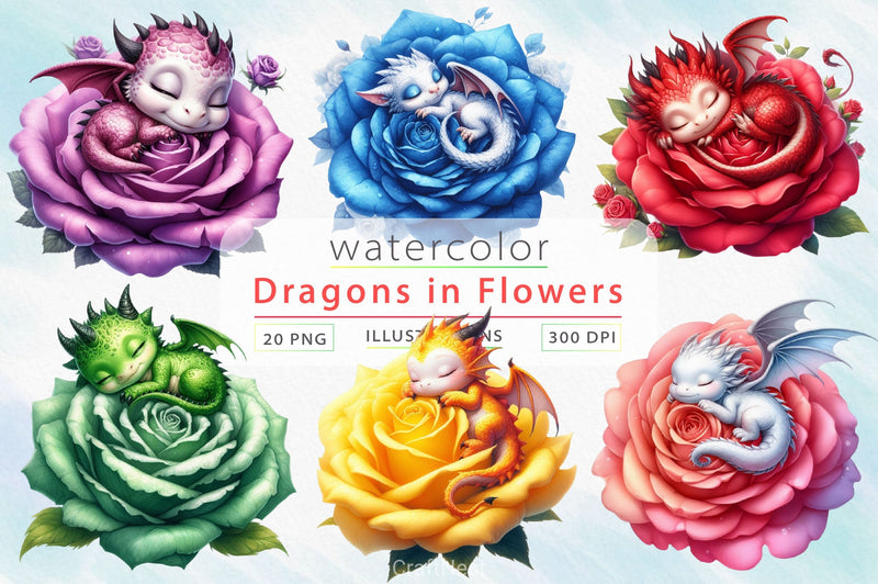 Adorable baby dragons nestled in flowers for fantasy nature projects.