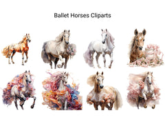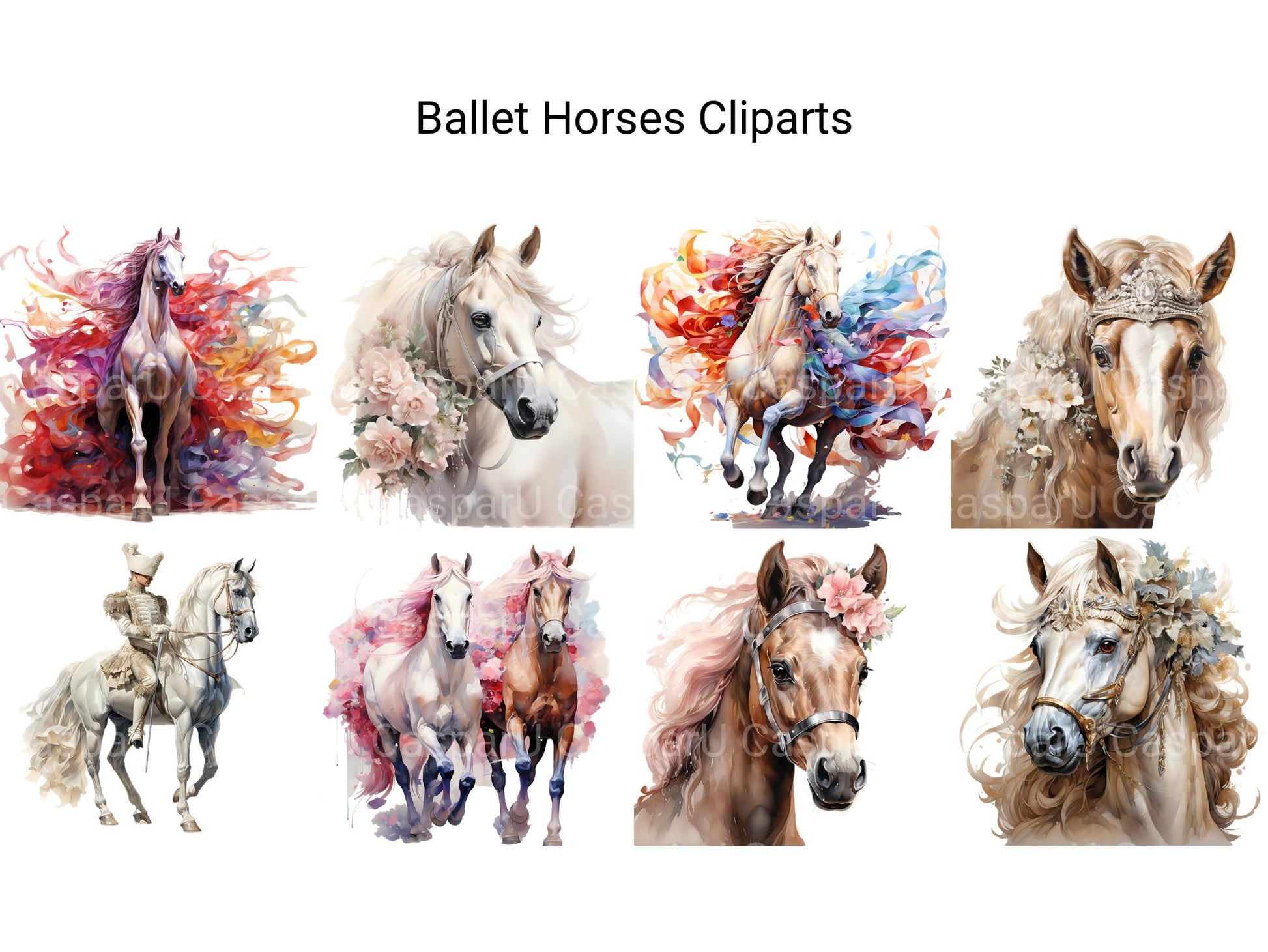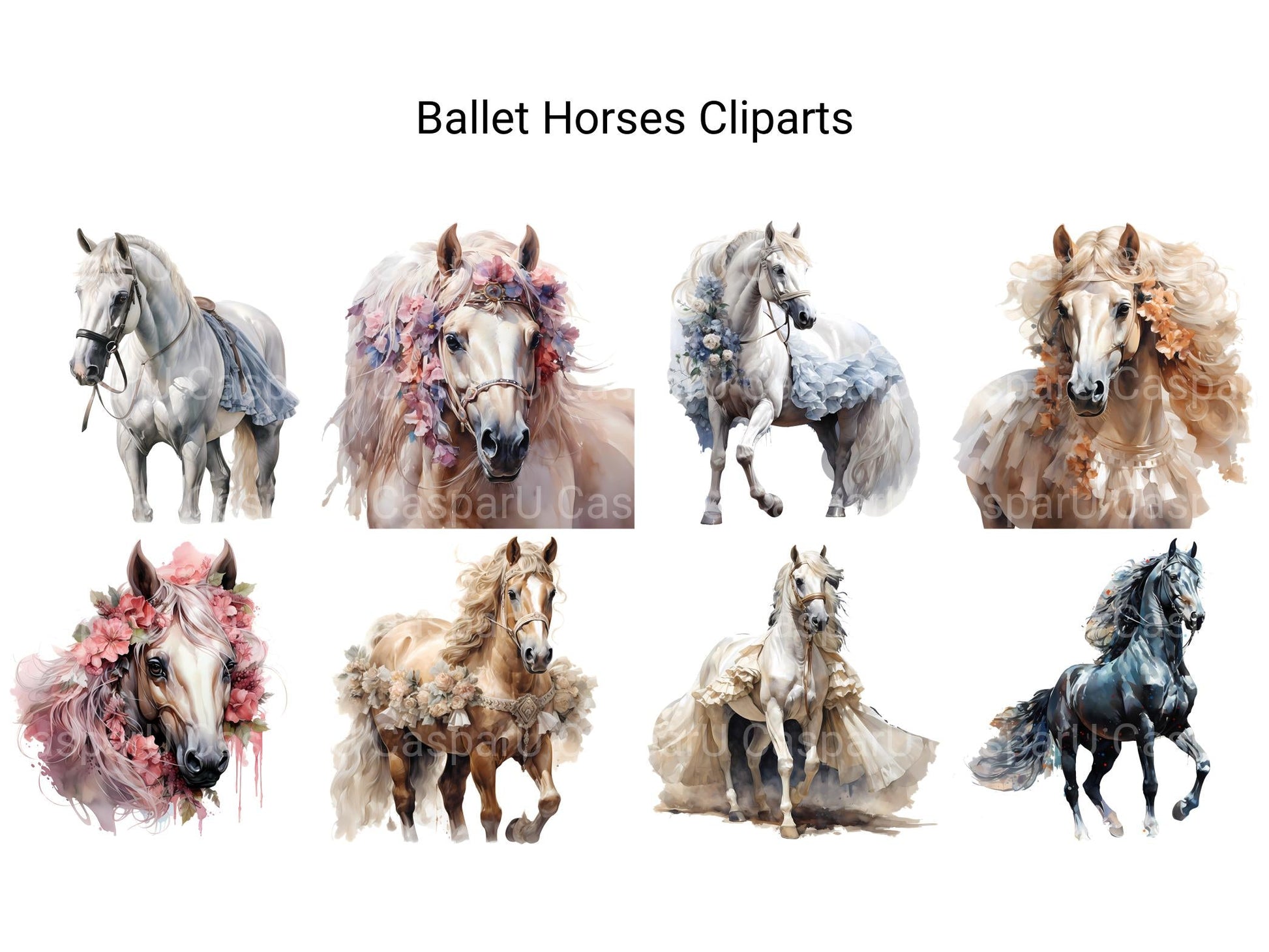 Dance into elegance with our Ballet Horses clip art. These graceful digital illustrations feature horses performing ballet poses with poise and grace, adorned with delicate tutus and tiaras, perfect for adding a touch of artistic beauty and balletic charm to your designs, whether for dance-themed artwork, ballet recital invitations, or equestrian ballet projects, capturing the enchanting allure of ballet horses in captivating detail.