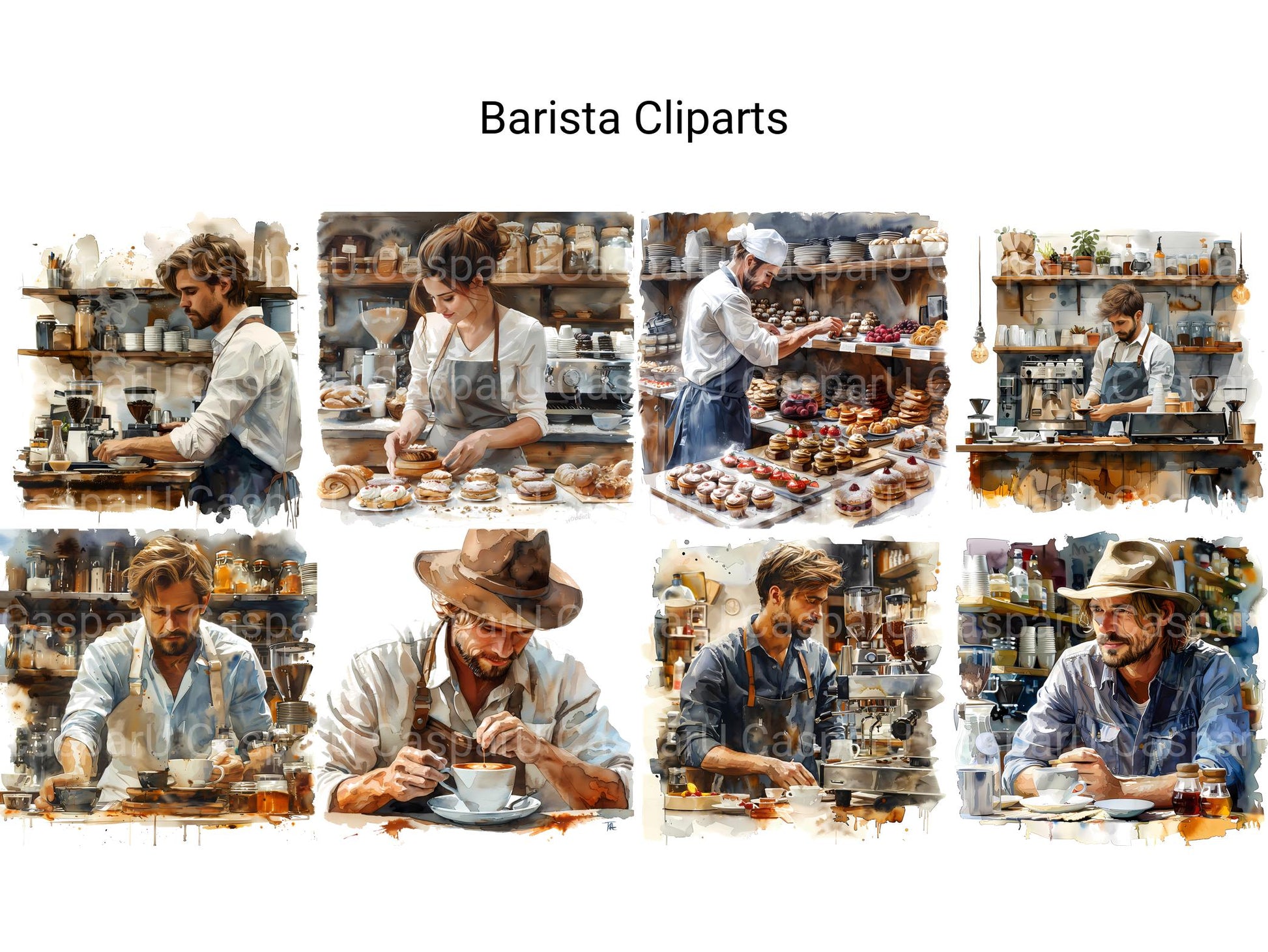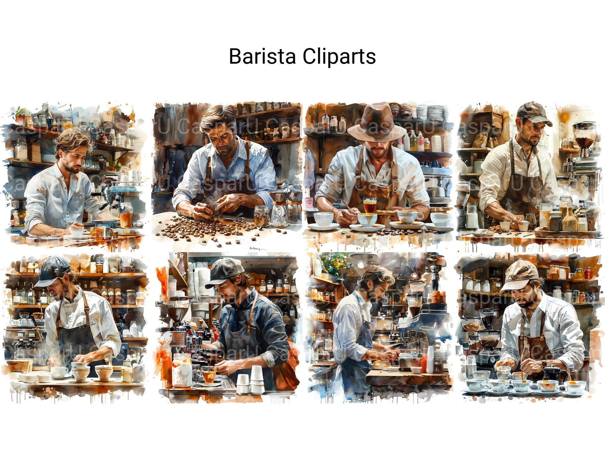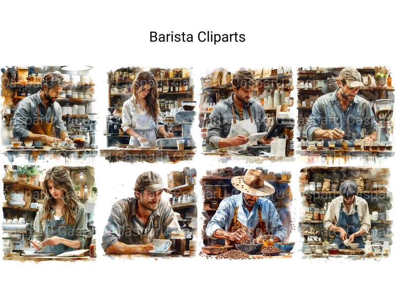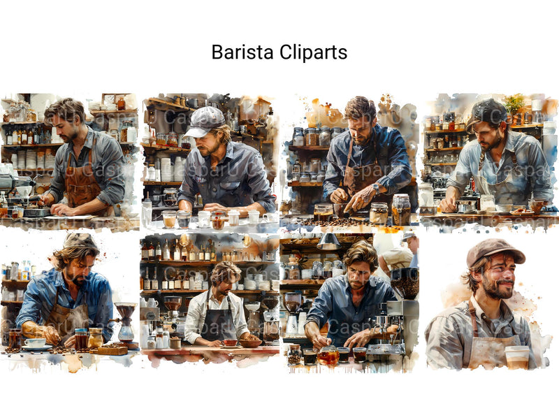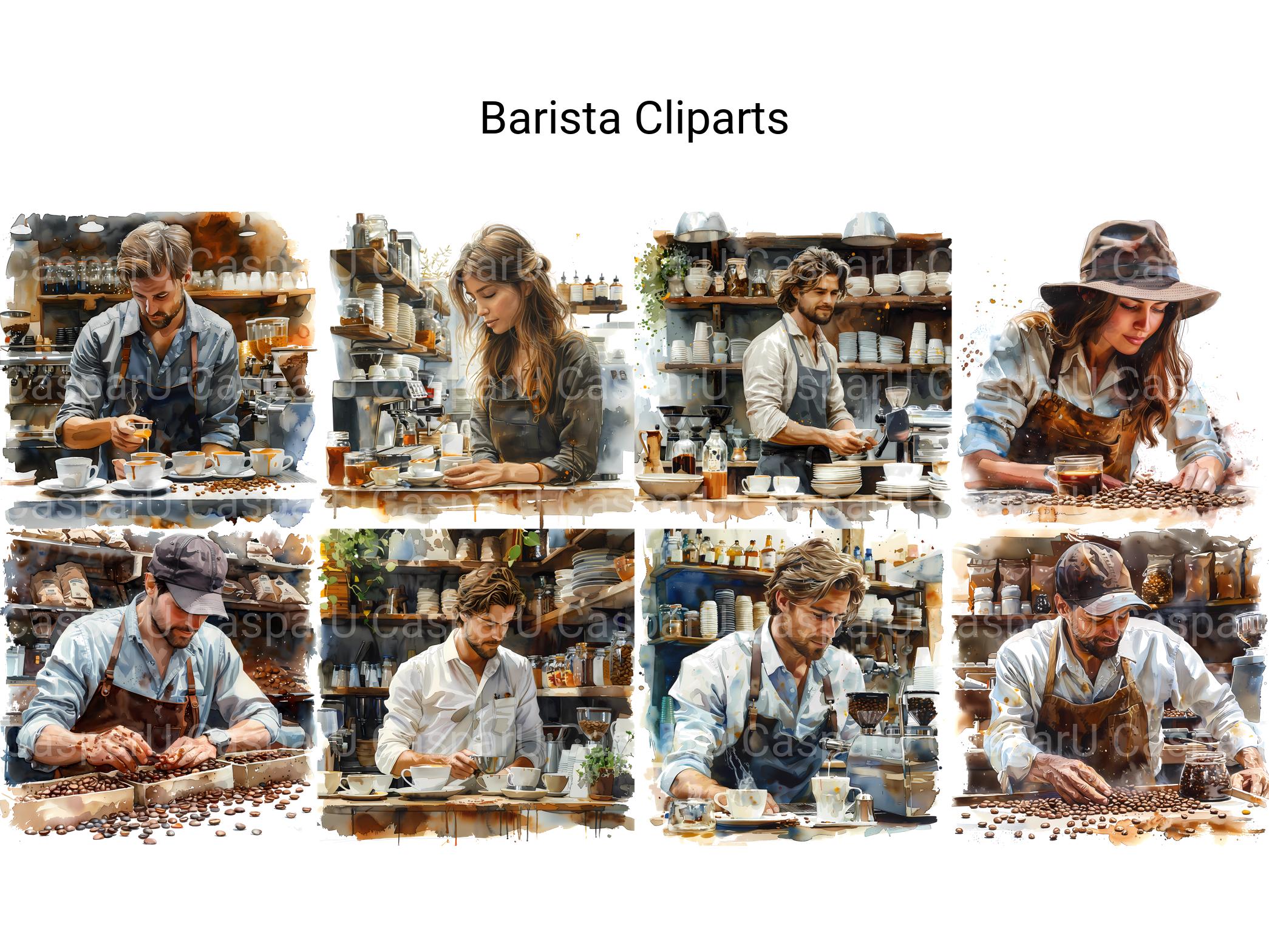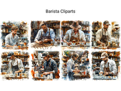 This barista-themed digital clipart collection includes coffee cups, espresso machines, and latte art. Ideal for café menus, coffee blogs, and cozy digital scrapbooks. Capture the warmth and charm of a favorite coffee shop with these delightful cliparts.