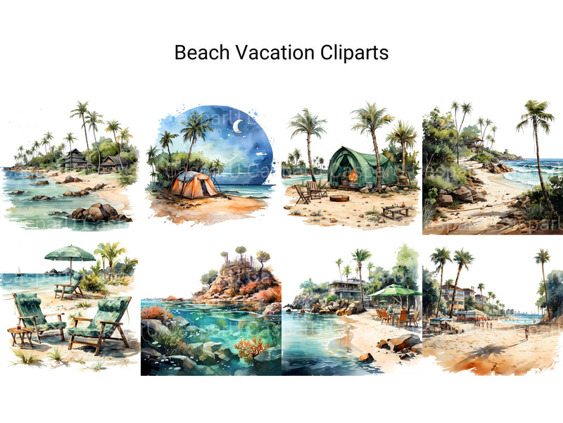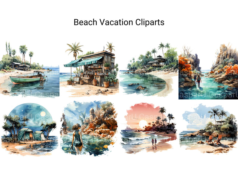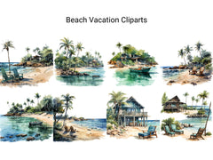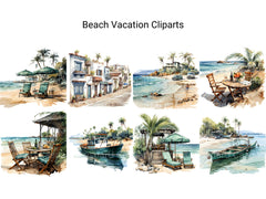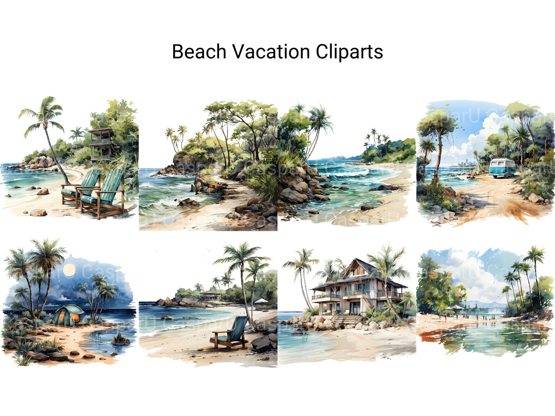 Escape to paradise with digital clip art showcasing palm-fringed beaches, turquoise waters, and tropical vibes. These illustrations capture the laid-back atmosphere and sunny bliss of a beach vacation, perfect for adding a touch of coastal charm to your projects, whether for travel brochures, vacation promotions, or beach-themed designs, inviting viewers to relax and unwind in the beauty of sun, sand, and sea.