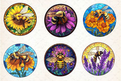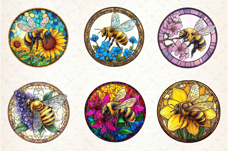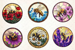 Bee With Flowers Round Stained Glass Art Clipart Bundle