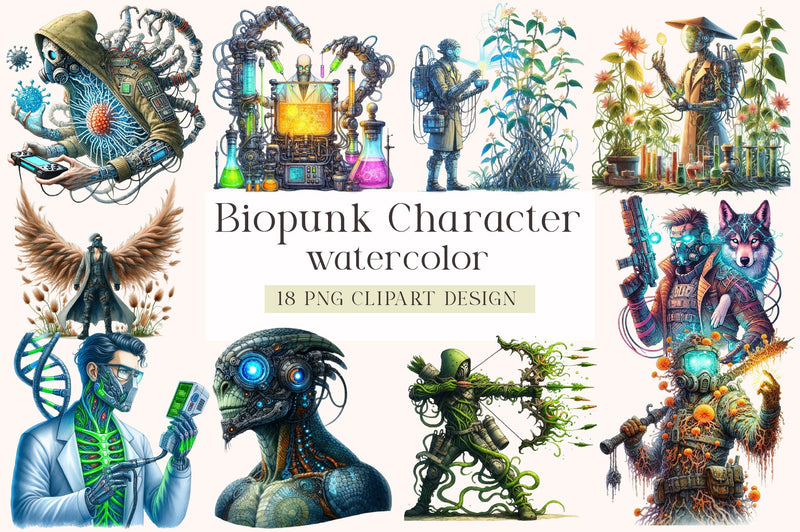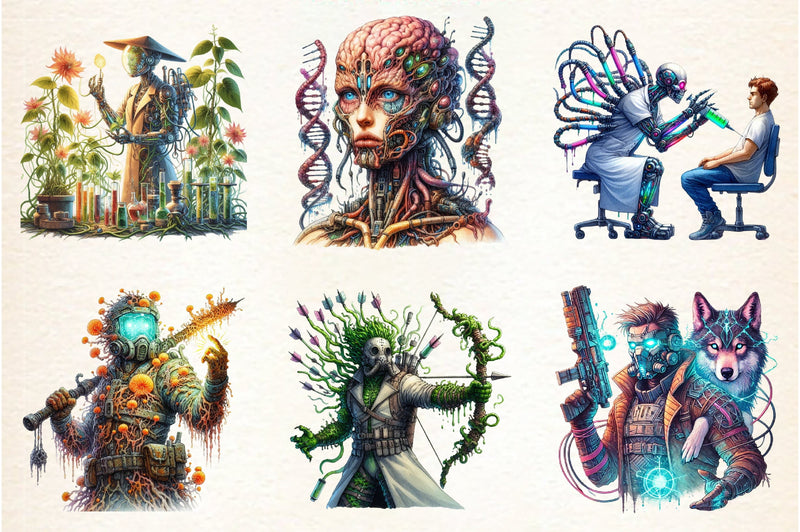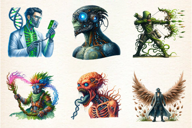 Transform your projects with the Biopunk Character Clipart Bundle, offering a diverse range of high-quality, imaginative characters for all your creative needs.