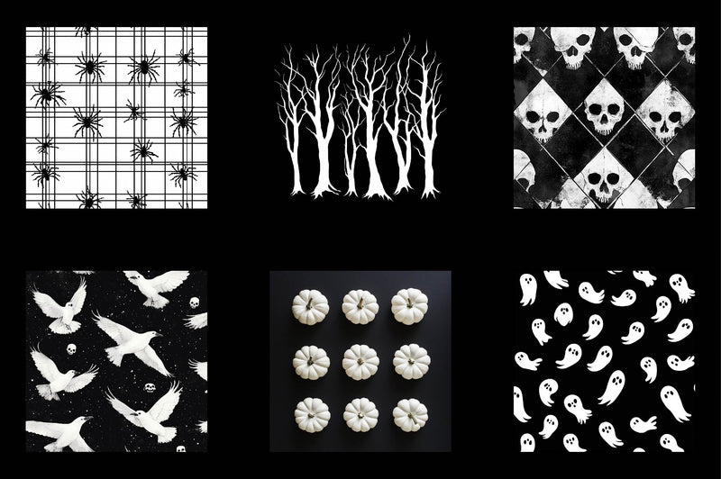 Haunt with this Black And White Halloween Digital Paper, featuring spooky monochrome designs, perfect for gothic Halloween crafts.