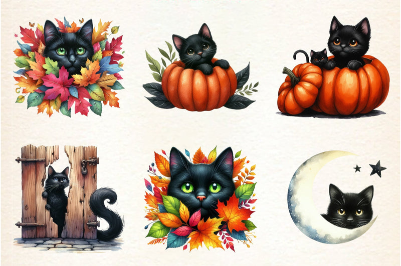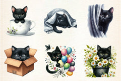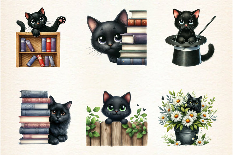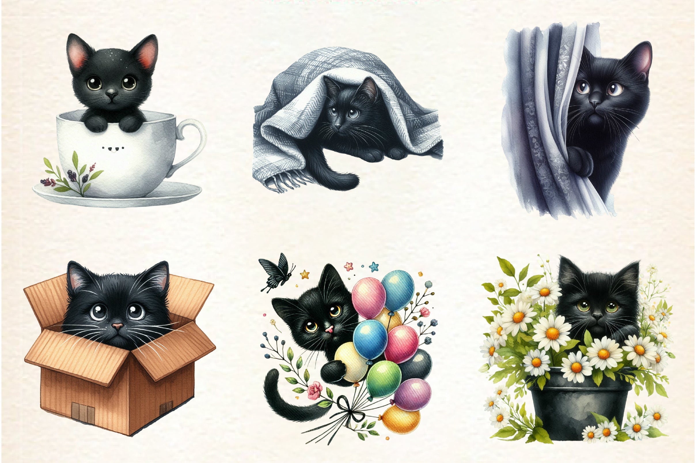 Enhance your digital creations with this versatile collection of black cat illustrations, ideal for scrapbooking, party favors, and personalized gifts.