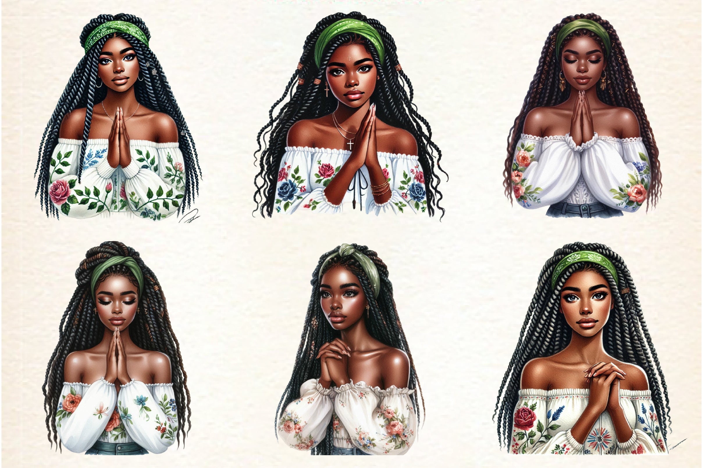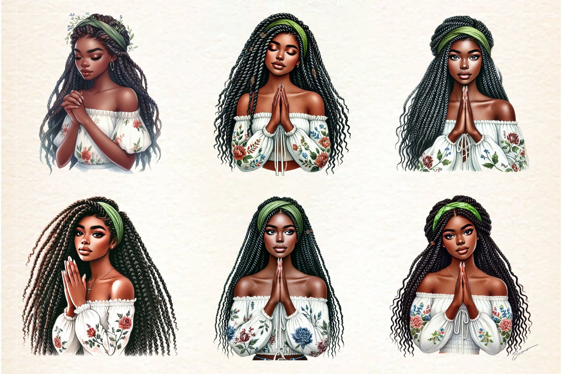 Enhance your digital creations with this unique collection of Black Girl Praying illustrations, ideal for personalized gifts, inspirational decor, and more.