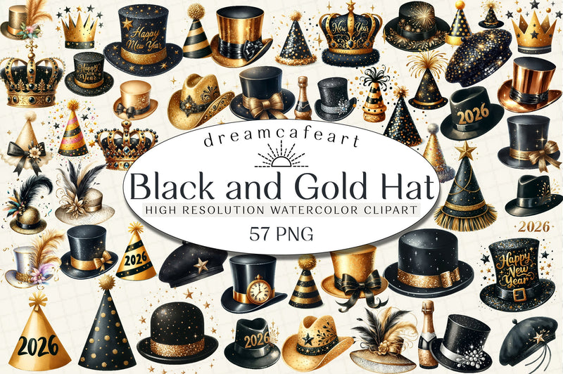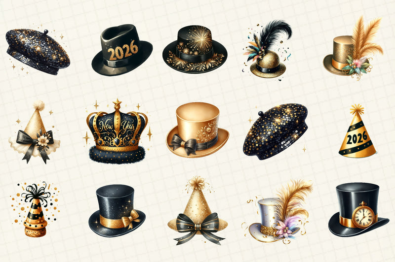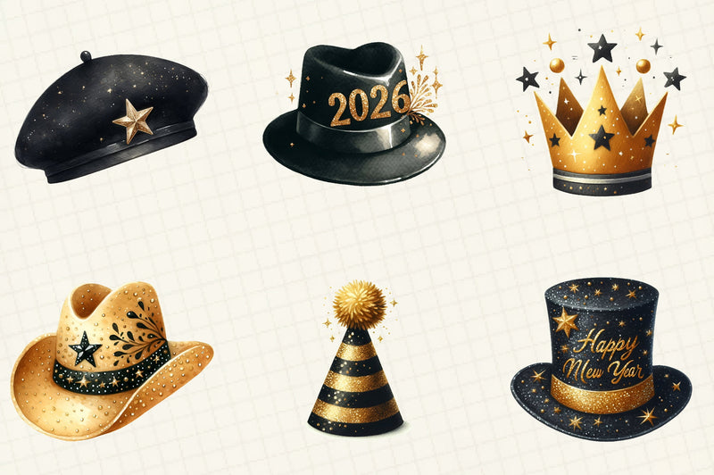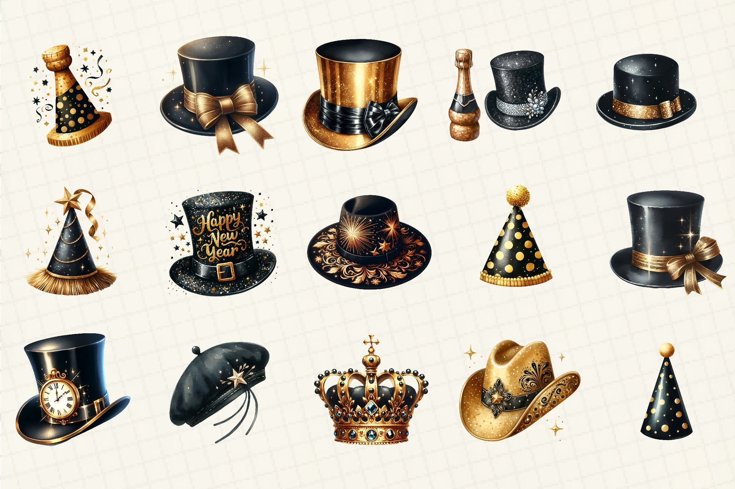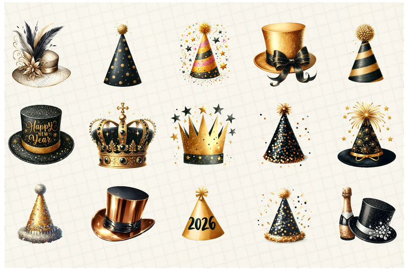 Celebrate in style with the Black Gold New Year Hat Clipart Bundle, featuring elegant and festive designs perfect for your holiday projects. Ideal for invitations, party decor, and digital scrapbooking, this versatile collection adds a touch of glamour to any celebration. Unleash your creativity with high-quality, easy-to-use clipart that captures the essence of New Year's Eve festivities. Elevate your designs with this must-have bundle, perfect for creating memorable and eye-catching visuals.