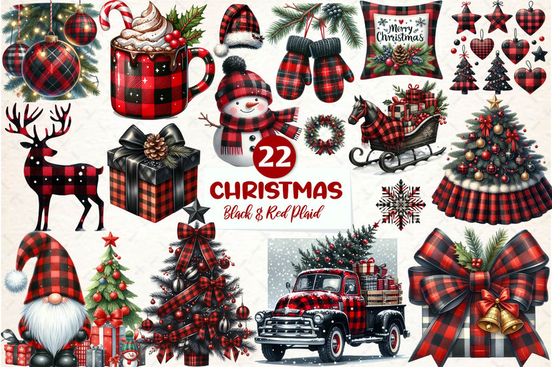 Pattern with this Black & Red Plaid Christmas Clipart Bundle, featuring checkered holiday designs, ideal for Christmas cottagecore crafts.