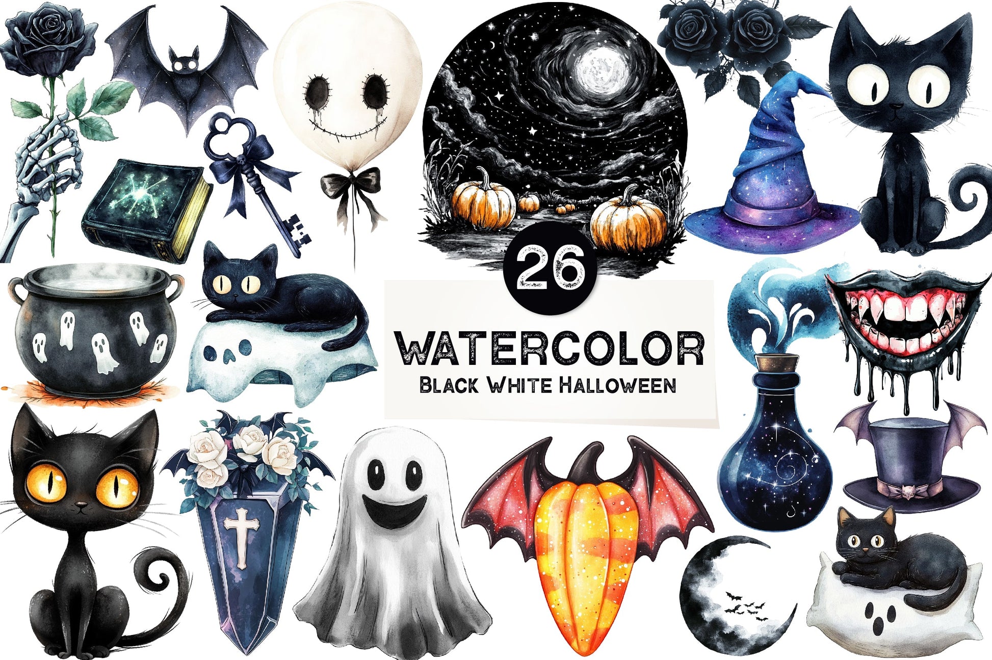 Contrast with this Black White Halloween Clipart Bundle, featuring monochrome spooky designs, ideal for elegant Halloween crafts.