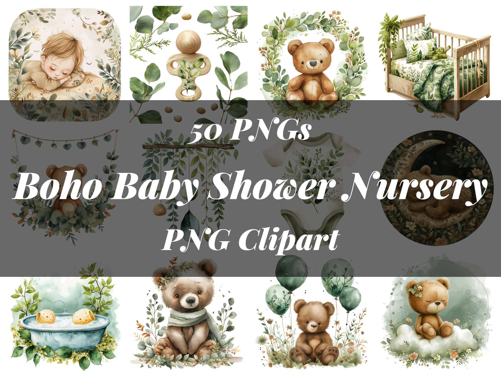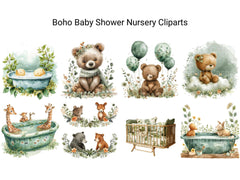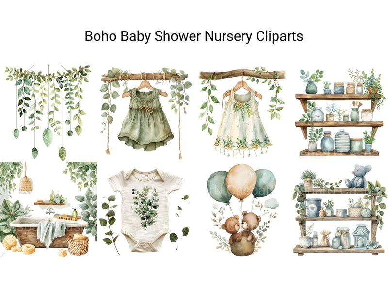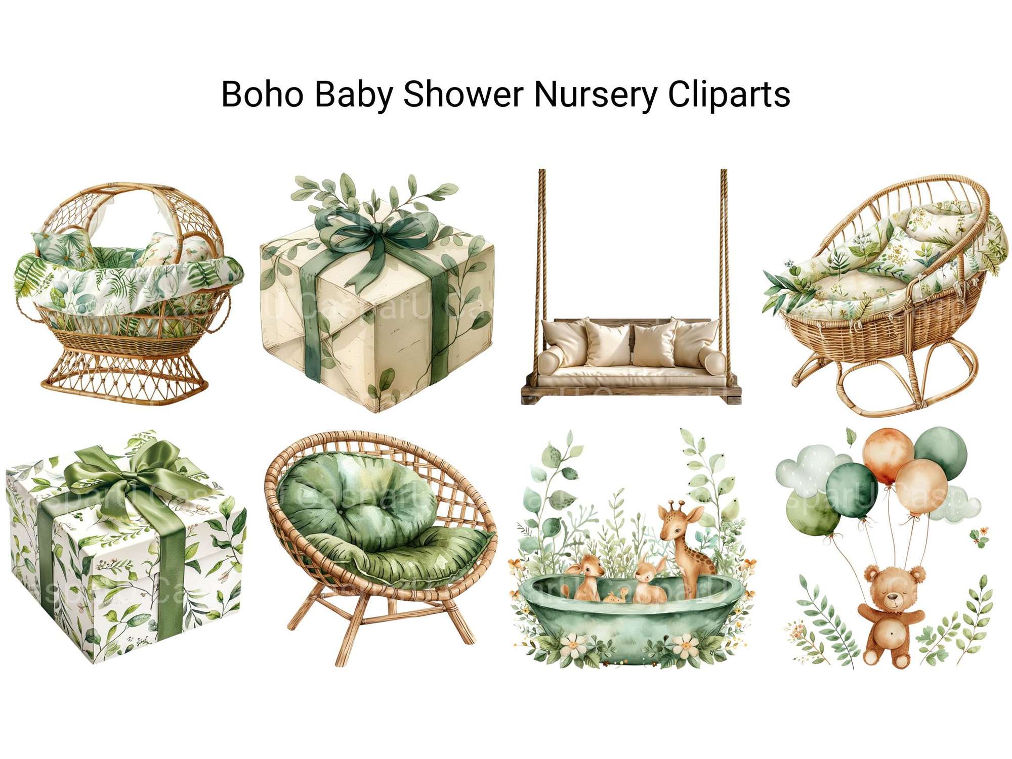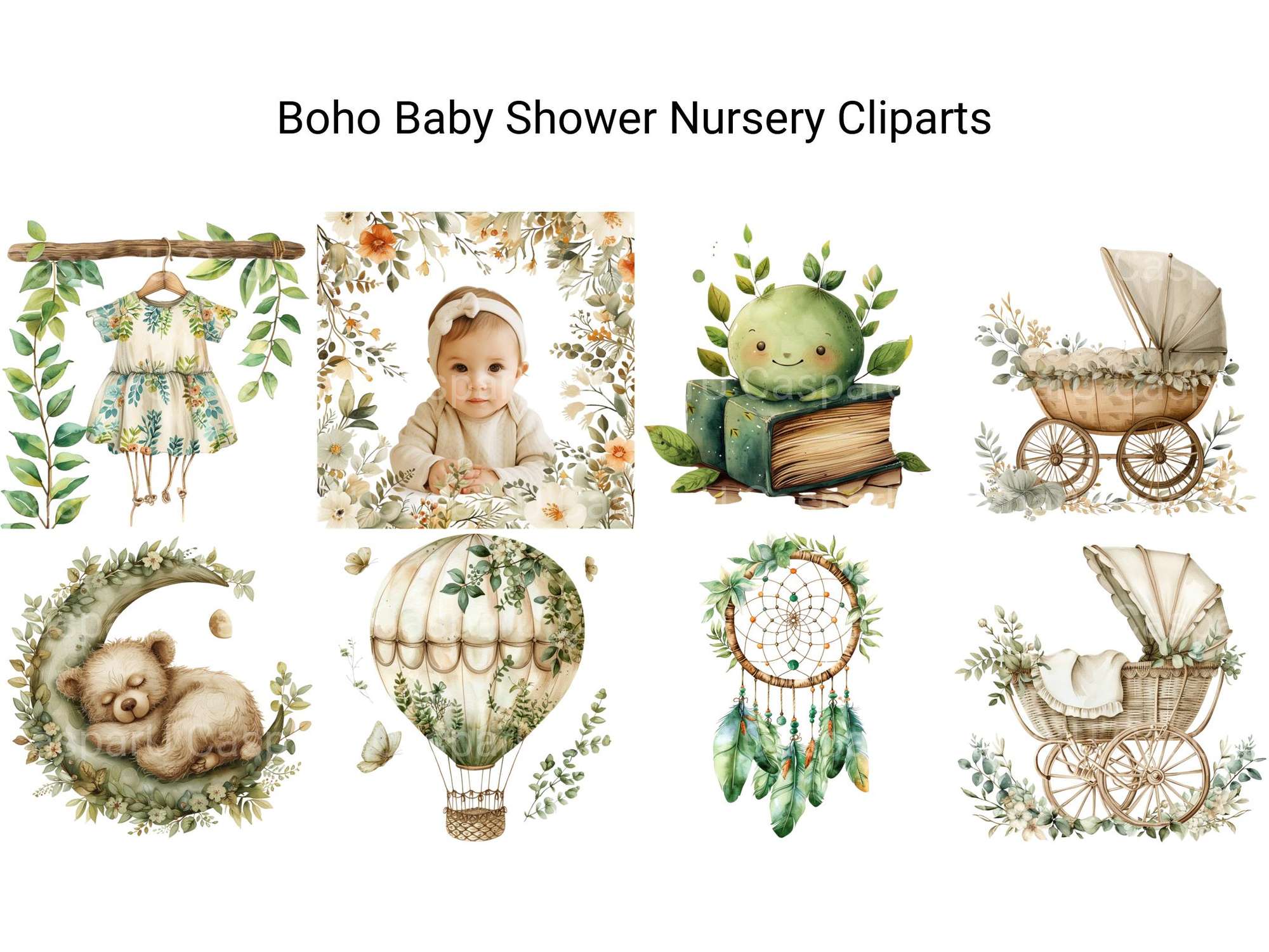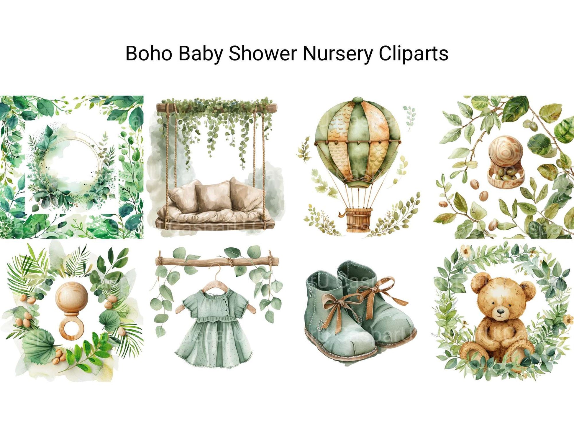 Create boho vibes with this Boho Baby Shower Nursery Clipart set, featuring green designs, perfect for nursery projects.
