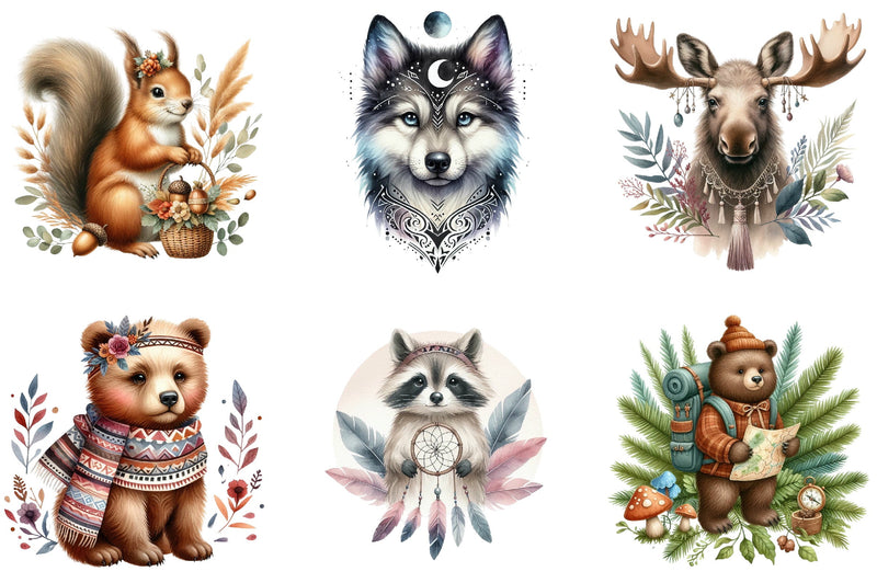 Unleash your creativity with this enchanting collection of bohemian-style woodland animals, ideal for scrapbooking, invitations, and more.