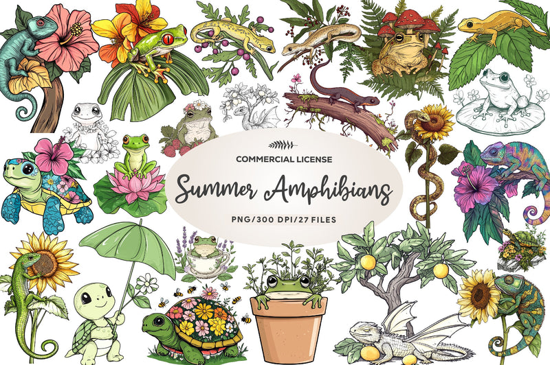 Explore with this Botanical Summer Amphibians & Reptiles Clipart Bundle, featuring nature creature designs, perfect for summer wildlife crafts.