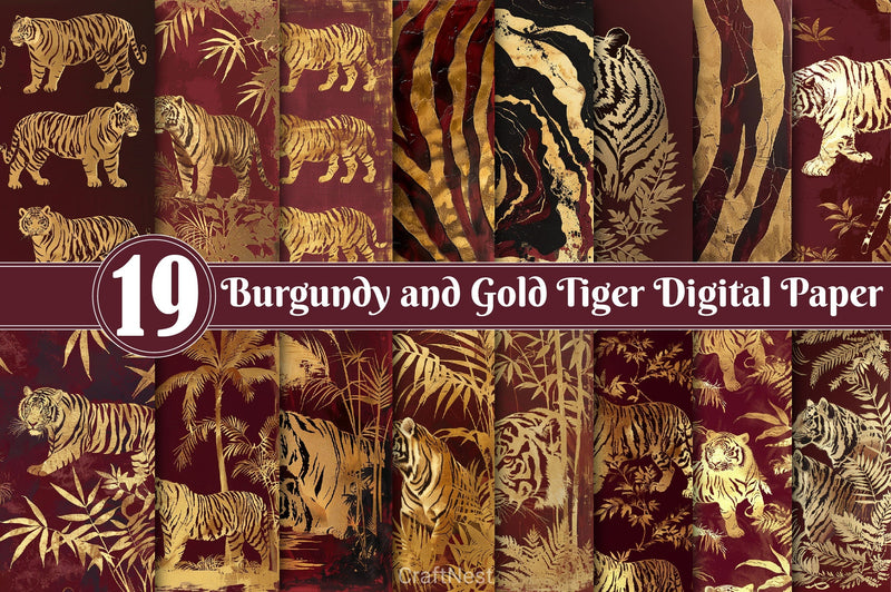Rich burgundy and gold tiger print digital papers perfect for wild and luxurious crafting.
