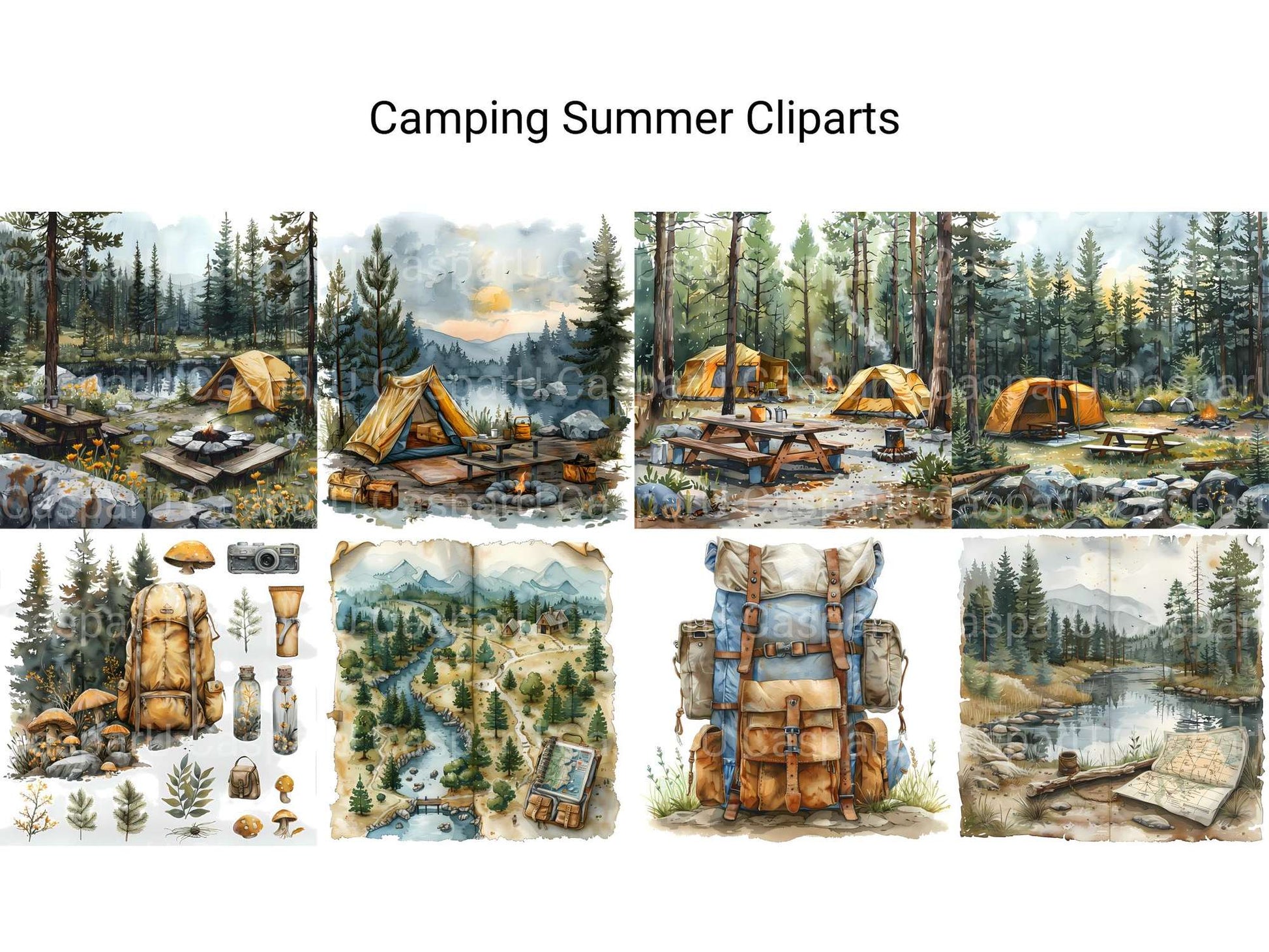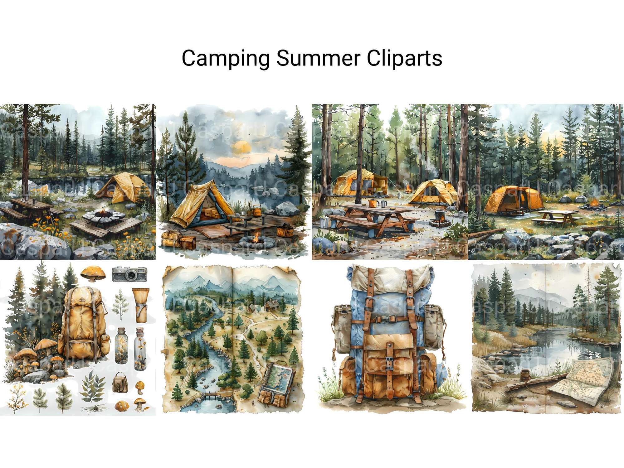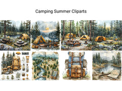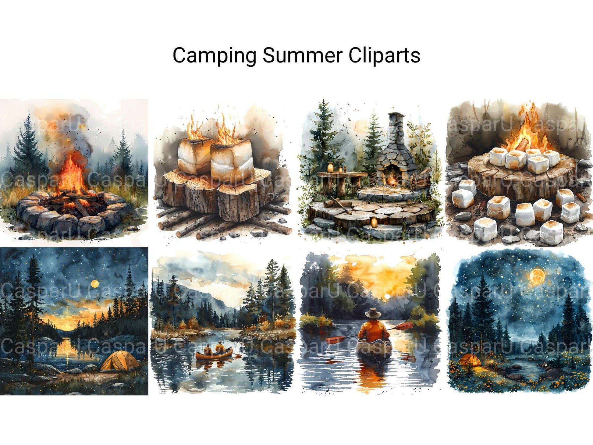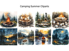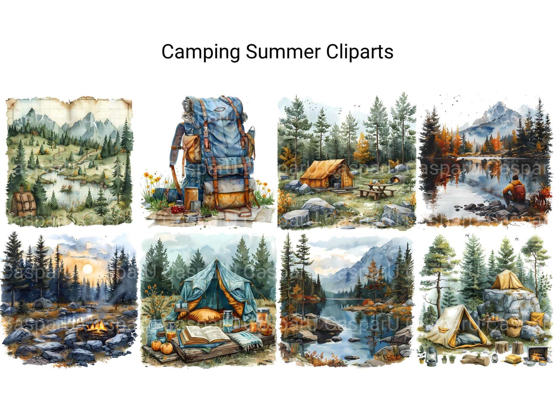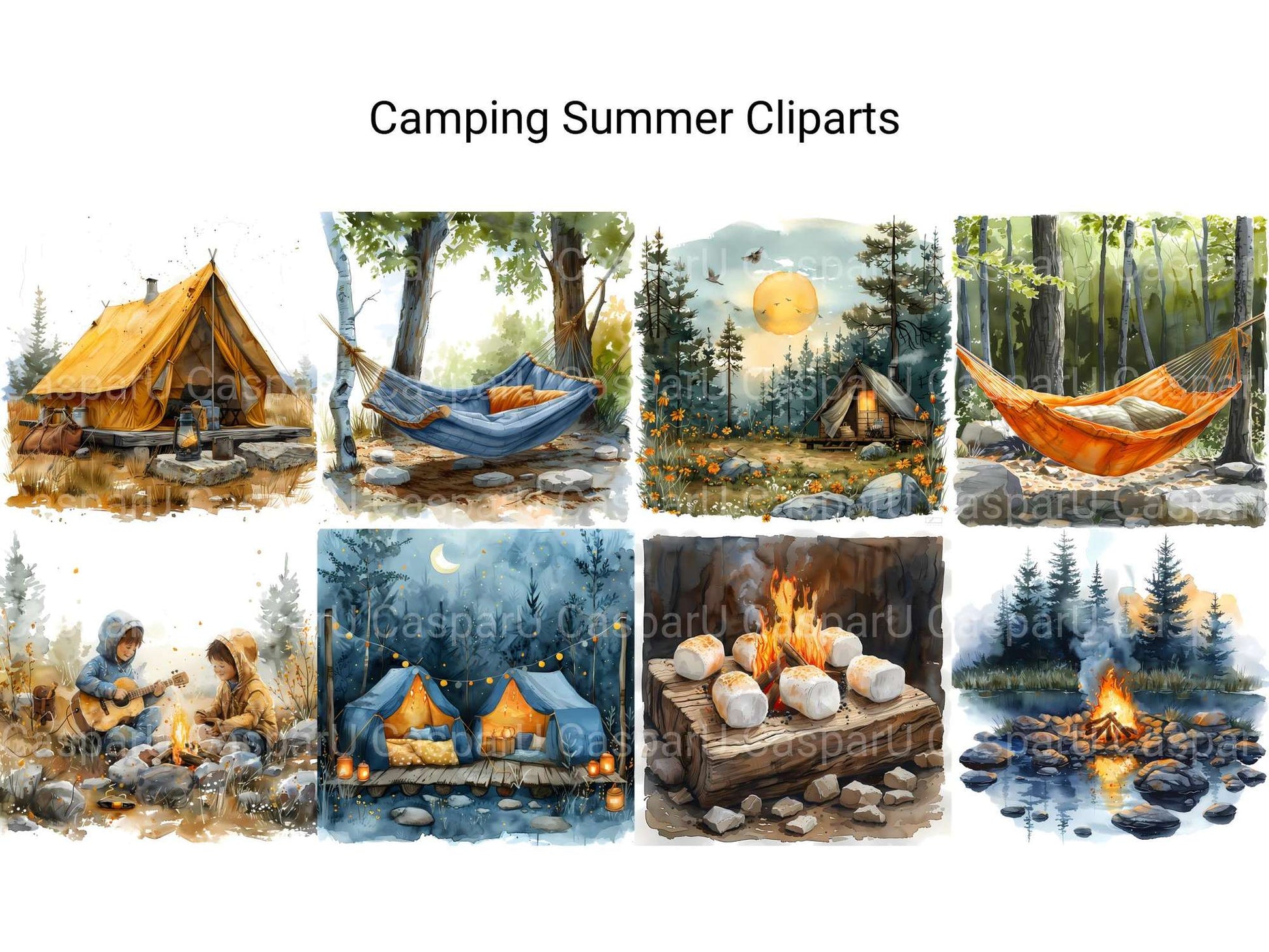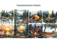 Enjoy the great outdoors with our Camping Summer clipart, depicting cozy campfires, scenic landscapes, and all the joys of a summer camping adventure. Each illustration invites you to relive the magic of starry nights, roasting marshmallows, and exploring nature, perfect for any outdoor-themed project.