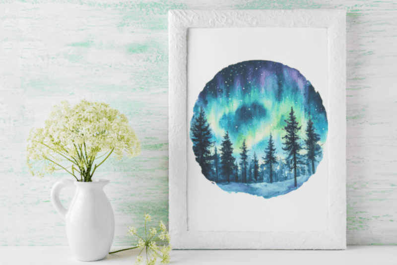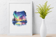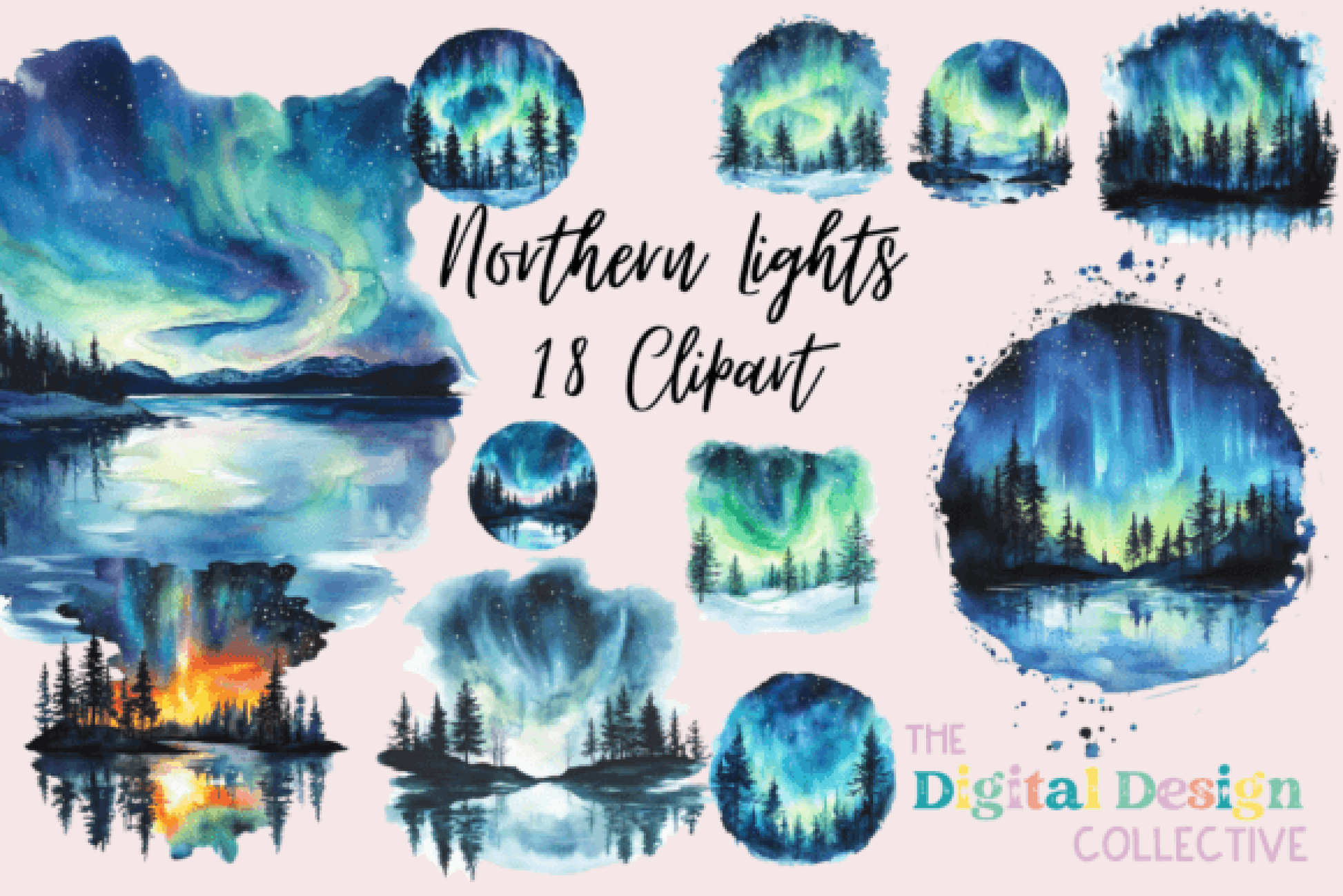 Experience the magic of the Aurora Landscape: Captivating Northern Lights Clipart Bundle. Perfect for digital projects, this collection showcases stunning aurora borealis designs, ideal for enhancing your creative endeavors with a touch of celestial beauty.