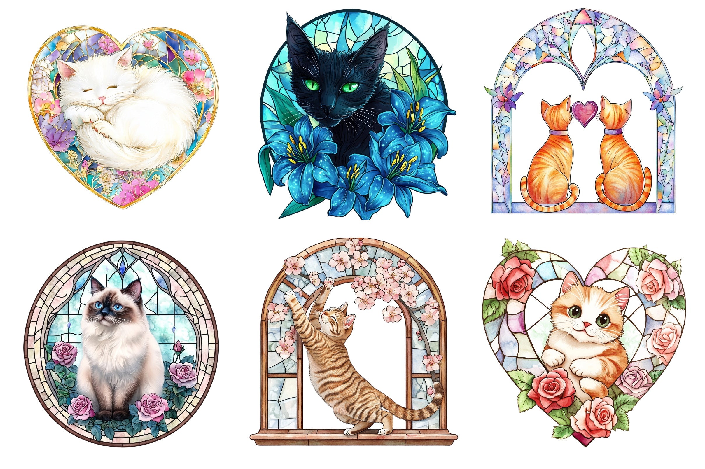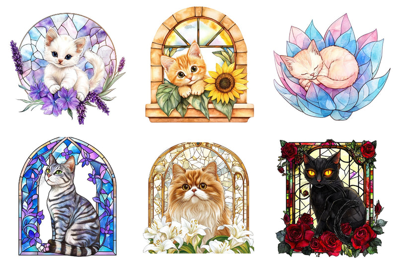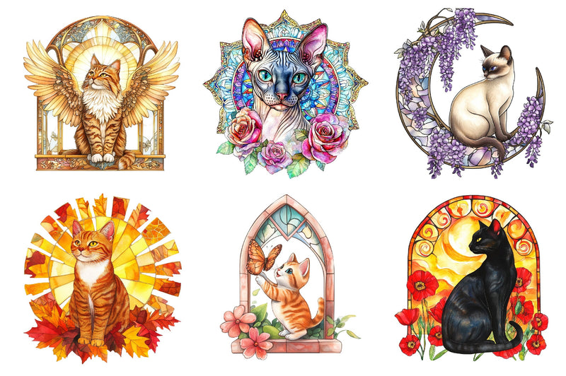 Cat Floral Stained Glass Clipart Bundle
