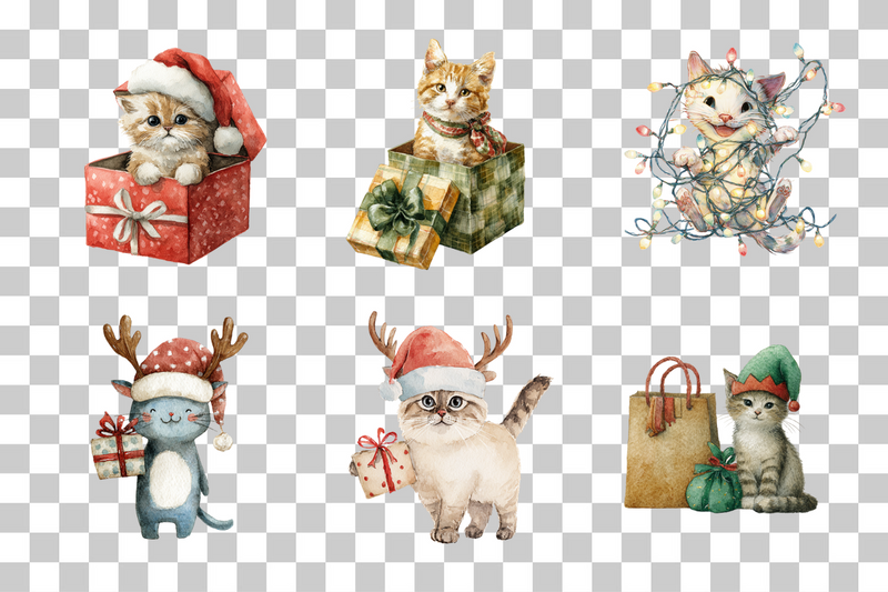 Transform your creations with these adorable Christmas kitten illustrations, ideal for holiday cards, gift tags, and more.