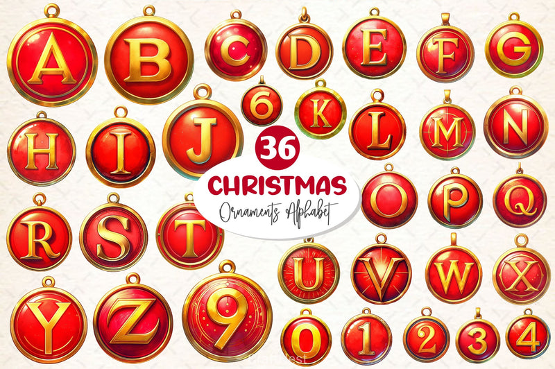 Alphabet letters designed as Christmas ornaments for educational holiday projects.