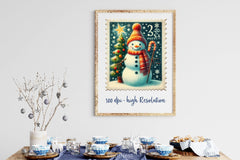 Vintage Christmas snowman postage stamps for holiday mail projects.