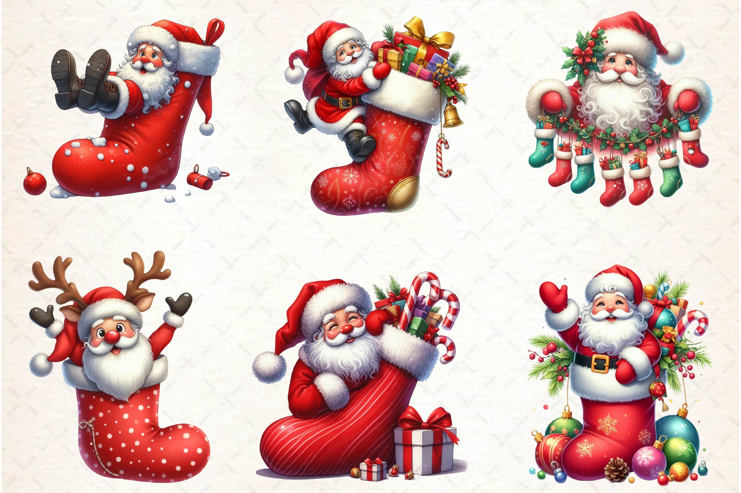 Hang with this Christmas Stocking Santa Clipart Bundle, featuring holiday sock designs, perfect for Christmas tradition crafts.