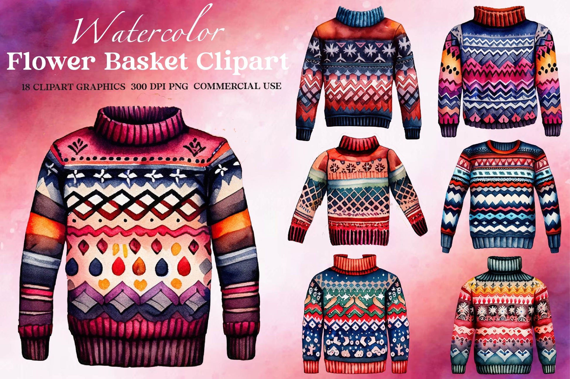 Cozy with this Christmas Sweater Clipart Bundle, featuring festive sweater designs, ideal for holiday apparel crafts.