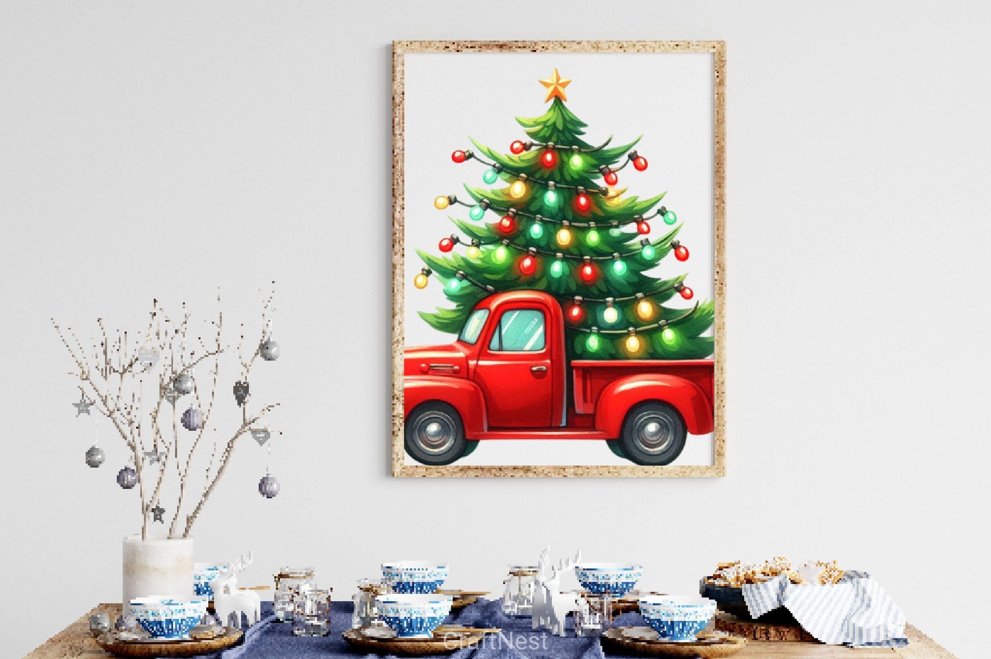 Festive trucks carrying Christmas decorations for holiday vehicle themes.
