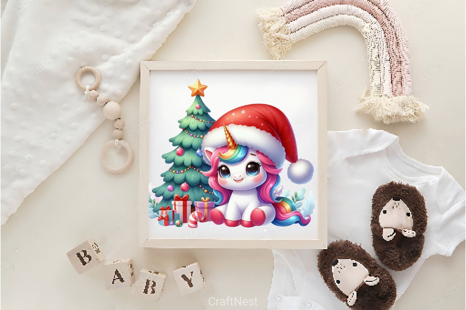 Magical unicorns celebrating Christmas for holiday fantasy projects.