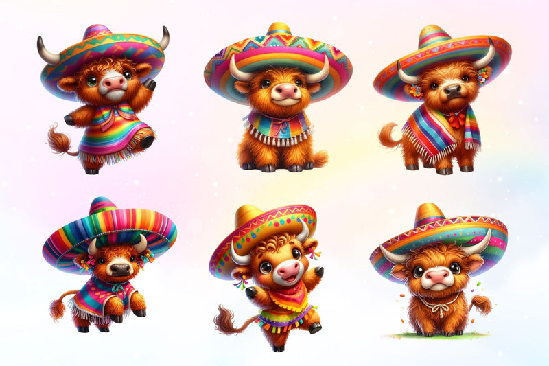 Fiesta with this Cinco De Mayo Highland Cow Clipart Bundle, featuring Mexican bovine designs, perfect for cultural celebration crafts.