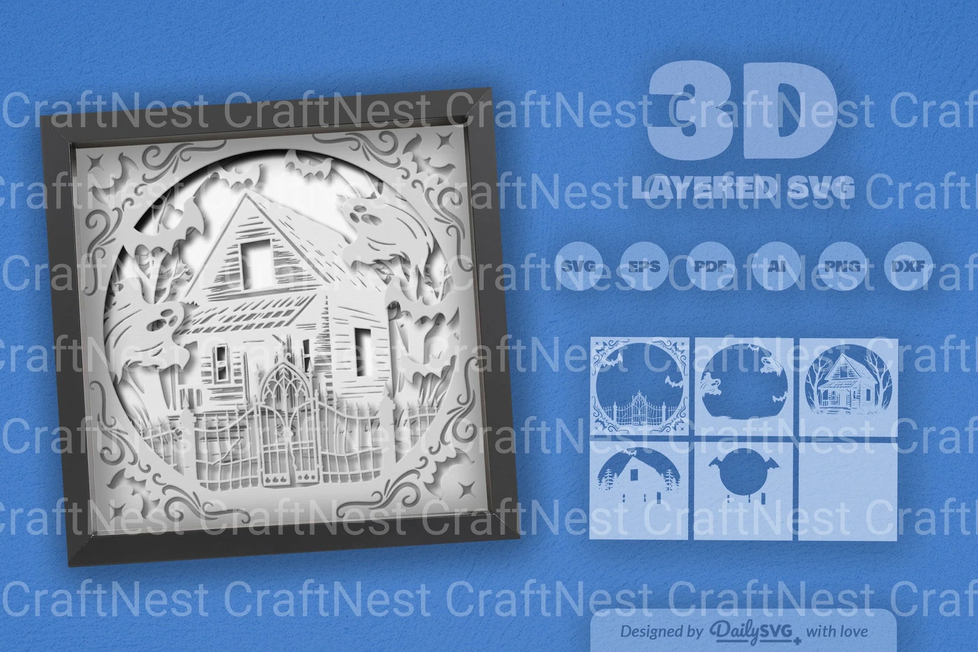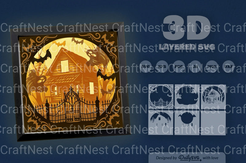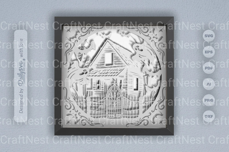 Discover the eerie charm of the Circle Haunted Cabin 3D Papercut SVG Bundle. Perfect for Halloween crafts, this bundle features intricate haunted cabin designs, ideal for creating spooky decorations and unique papercut art projects.