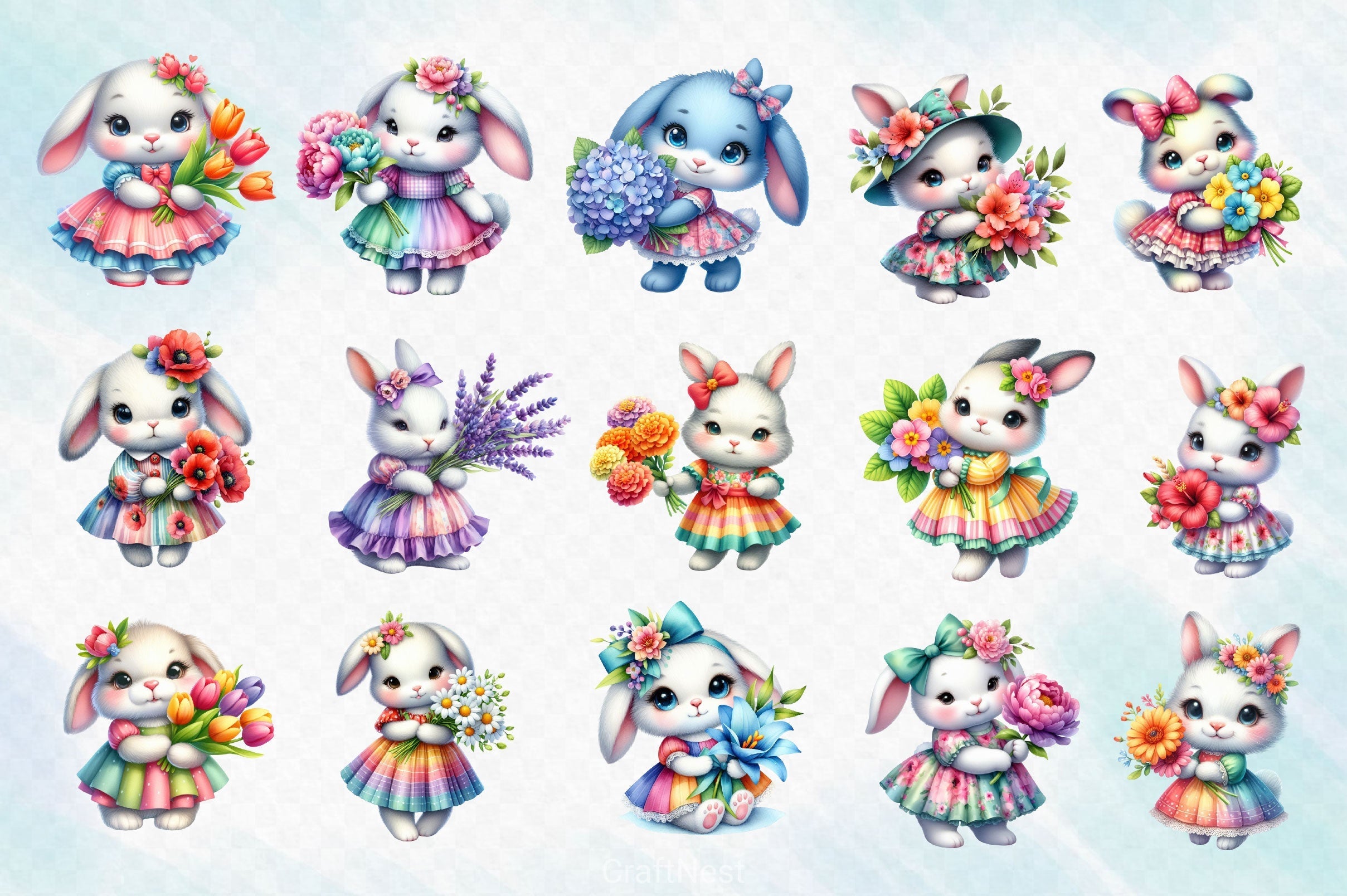 Gather with this Collection Of Bunny And Bouquet Clipart Bundle, featuring rabbit flower designs, perfect for Easter garden crafts.