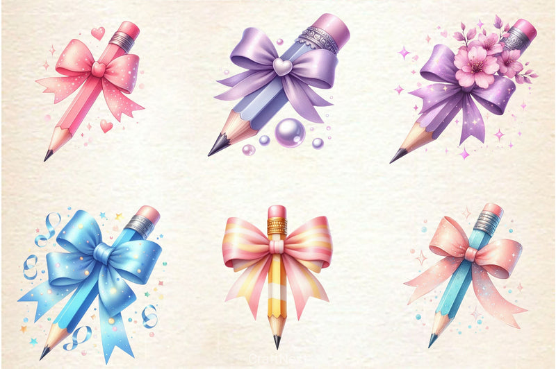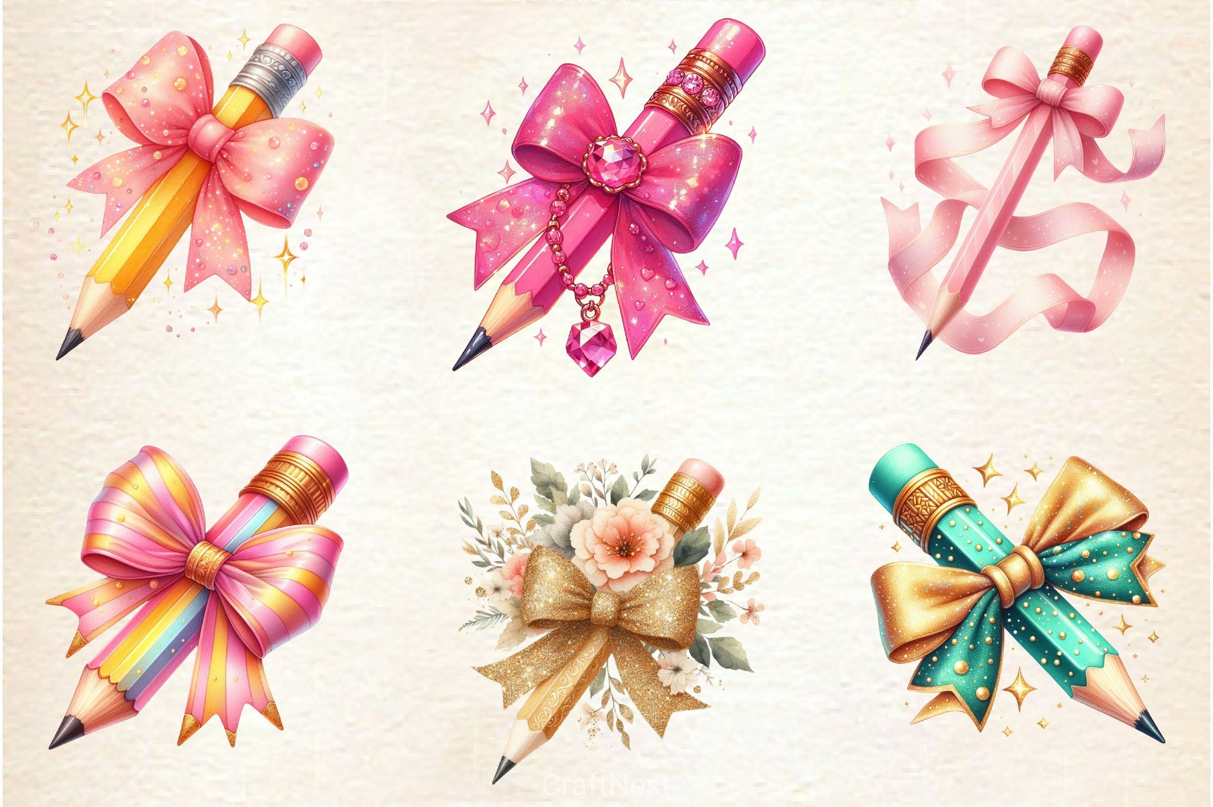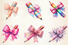 Study with this Colorful Coquette Pencil School Clipart Bundle, featuring girly school supplies, perfect for student fashion crafts.