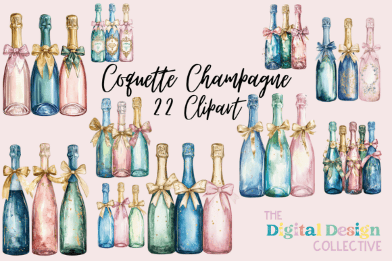 Elevate your designs with the Coquette Champagne Clipart Bundle, featuring elegant champagne-themed illustrations perfect for weddings, celebrations, and sophisticated projects.