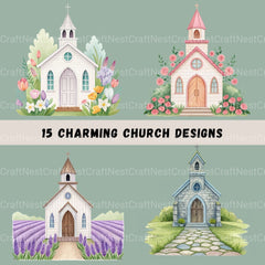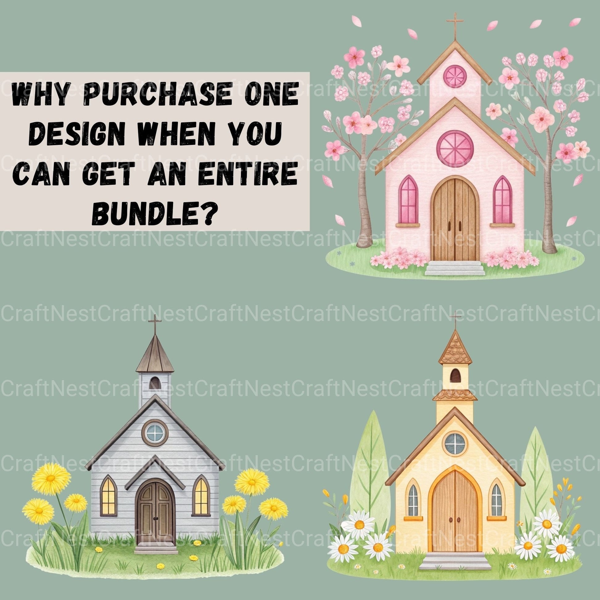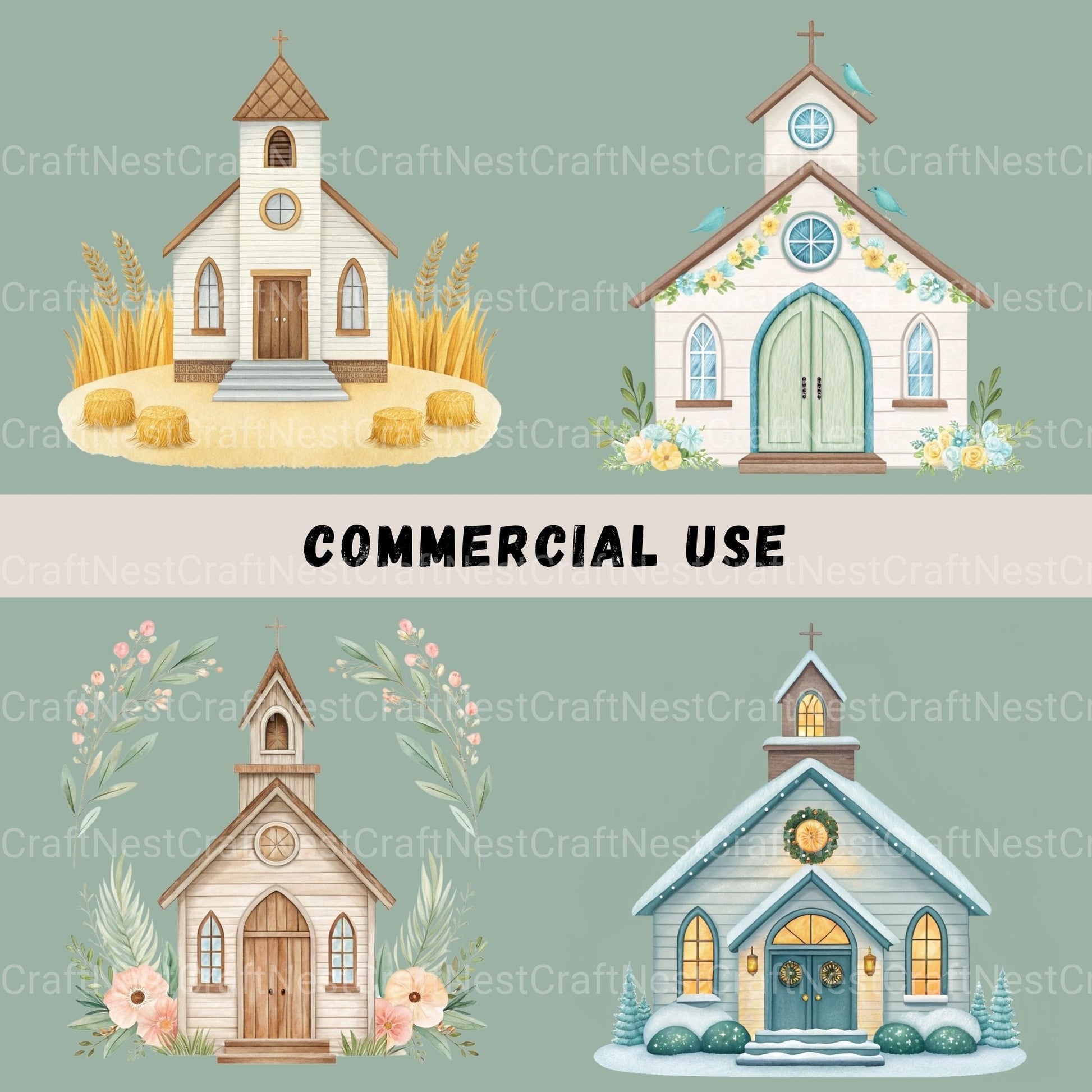 Worship with this Countryside Churches 15 Clipart Bundle, featuring rural church designs, ideal for Christianity travel crafts.