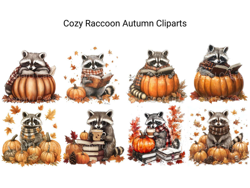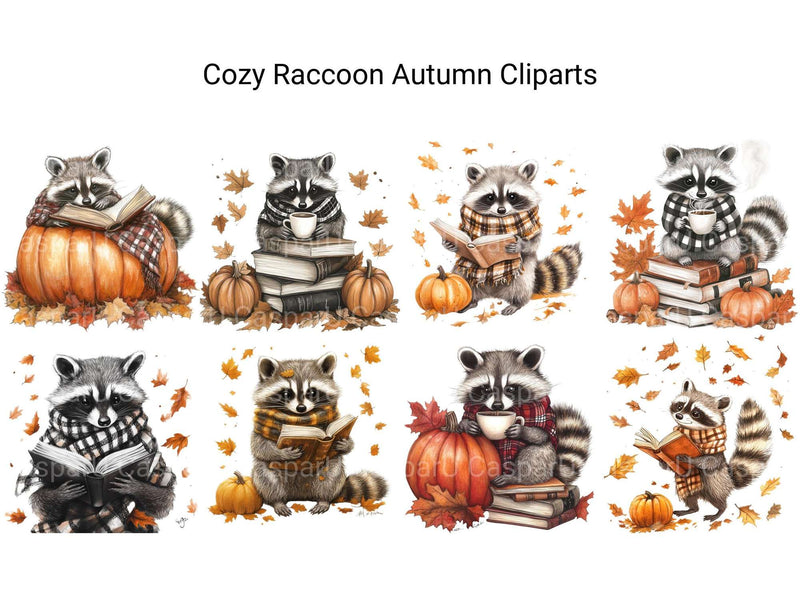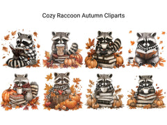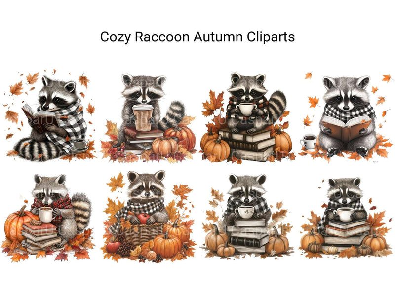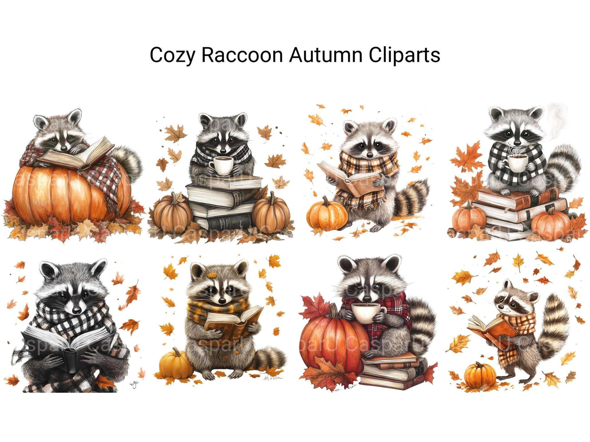 Snuggle up with this Cozy Raccoon Autumn Clipart set, featuring cute raccoons in fall settings, perfect for seasonal projects.