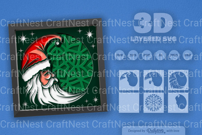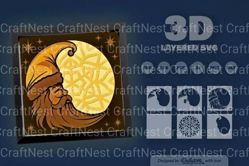 Unleash holiday creativity with the Crescent Moon Santa Claus Papercut SVG Bundle, featuring intricate Santa designs perfect for festive crafts and decorations.