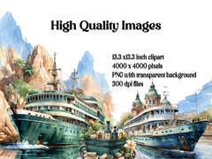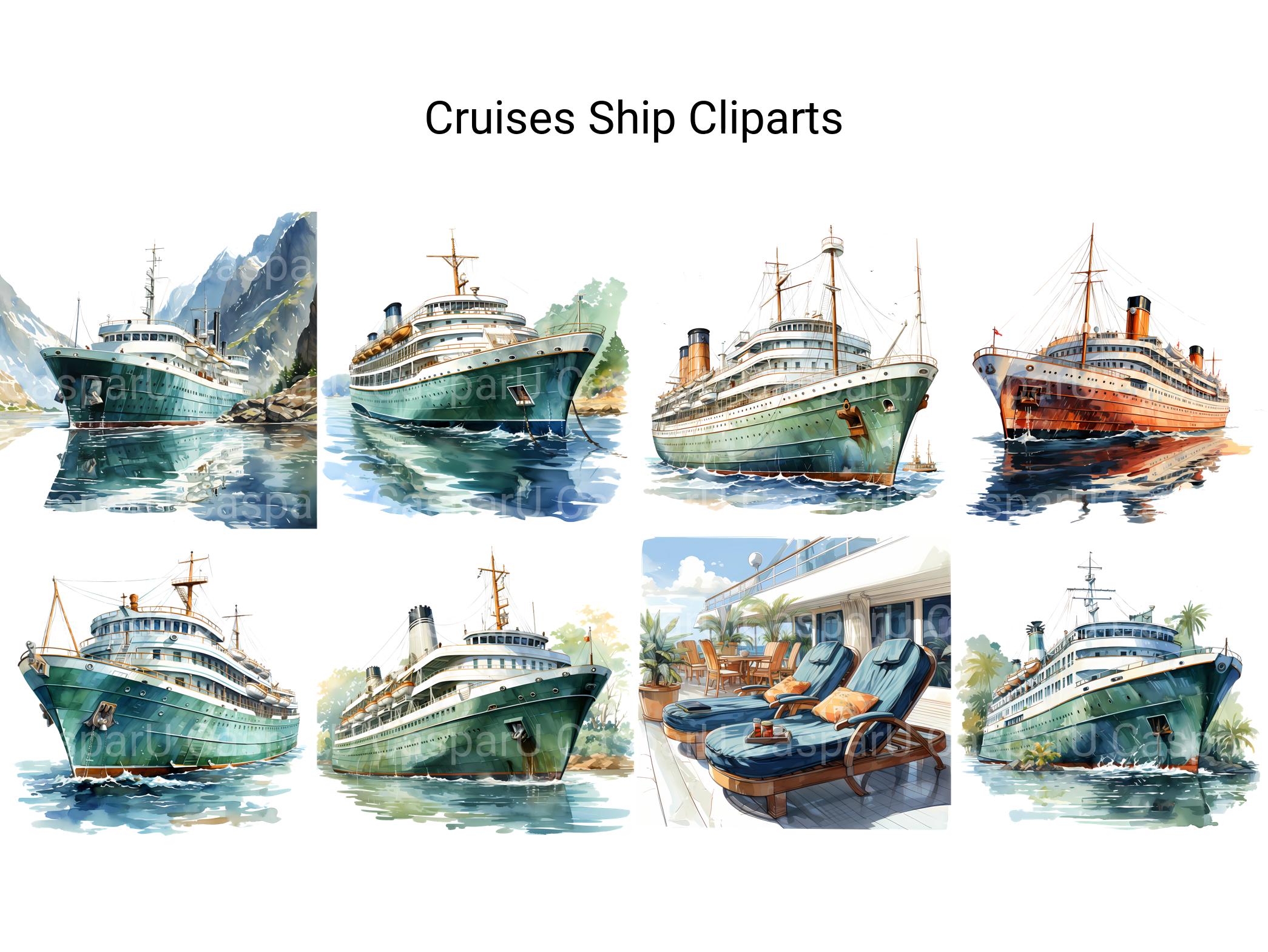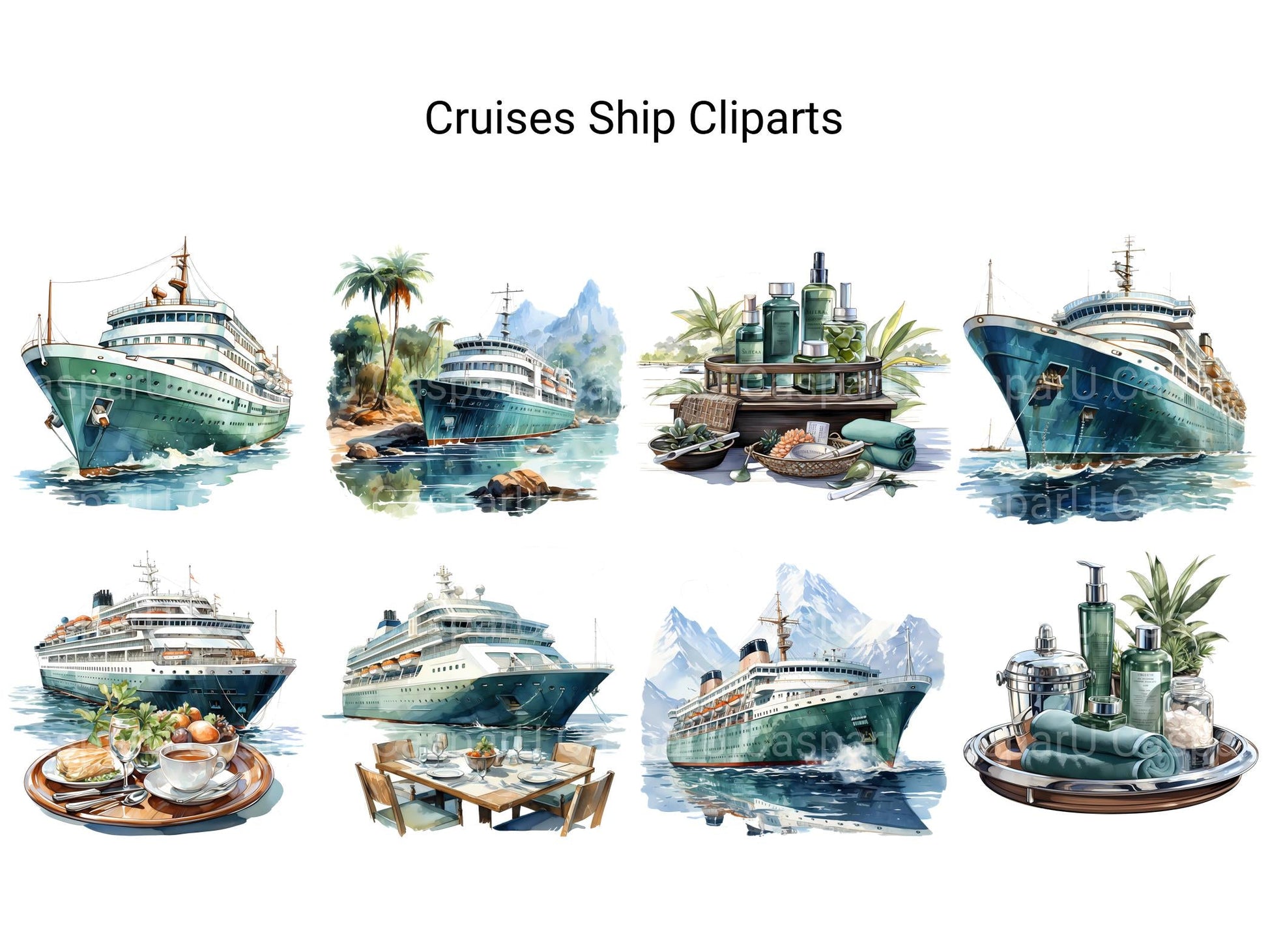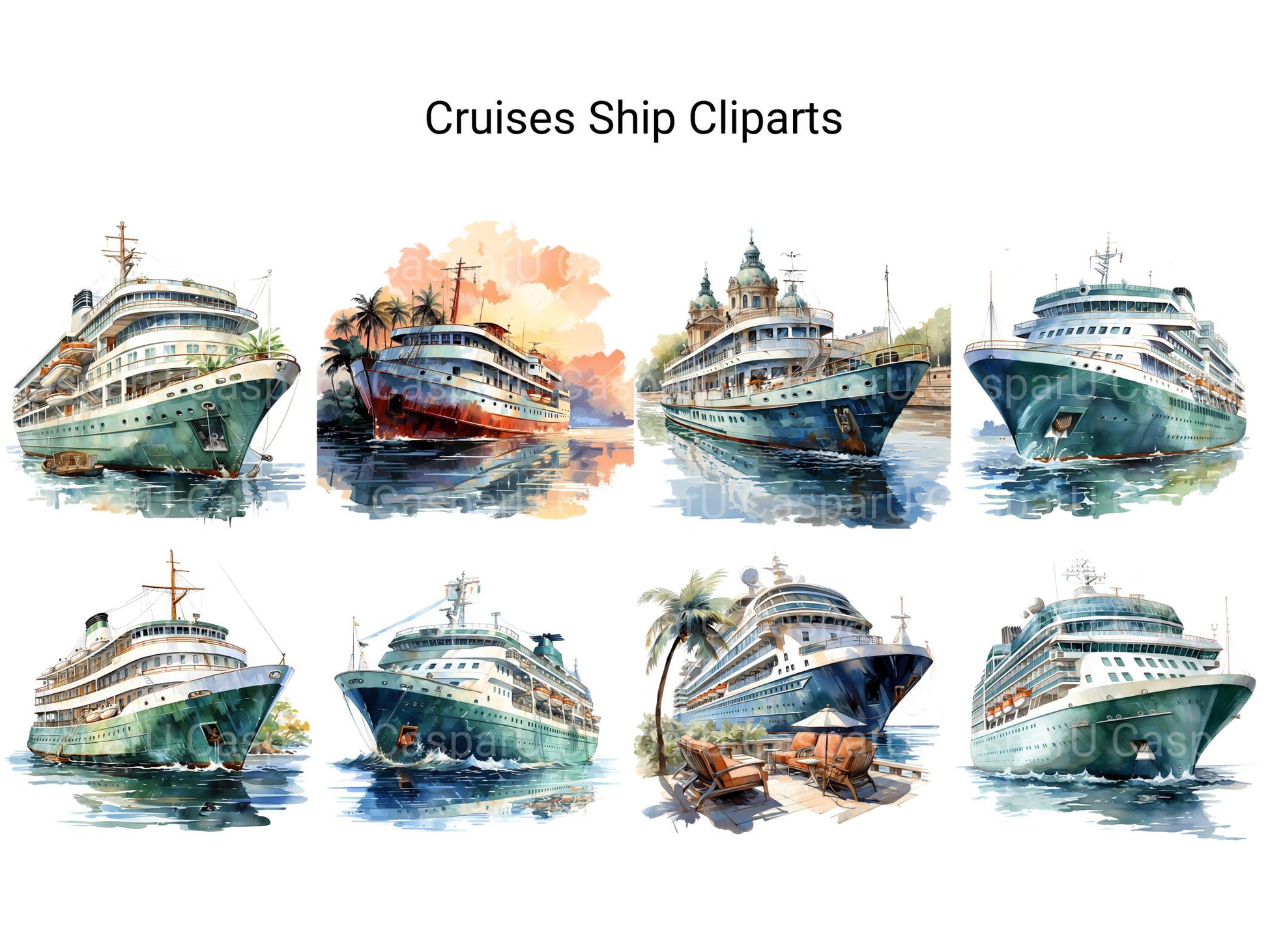Set sail on a voyage of luxury and adventure with digital clip art showcasing majestic cruise ships, exotic ports of call, and onboard activities. These illustrations capture the elegance and excitement of cruising, perfect for adding a touch of nautical charm to your projects, whether for travel brochures, cruise promotions, or vacation-themed designs, inviting viewers to embark on a journey of relaxation and exploration on the high seas.