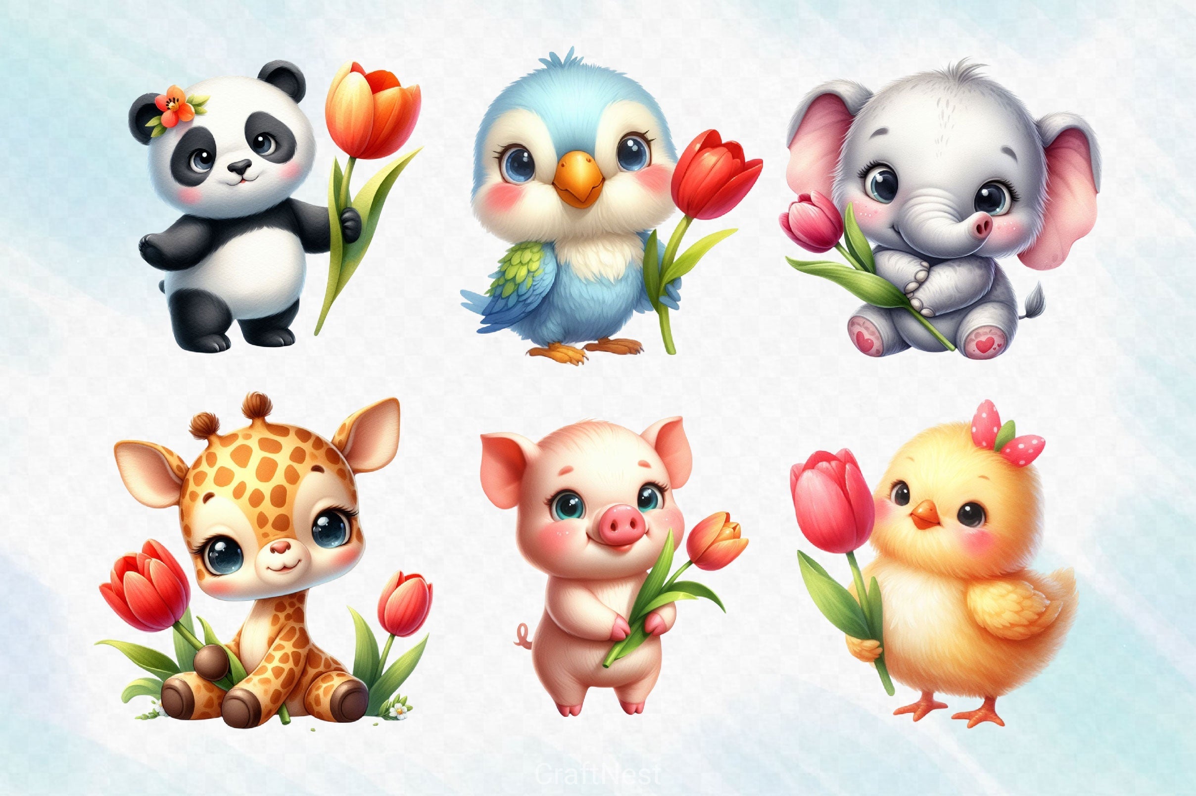 Cute Animals And Tulip Flower Clipart Bundle 2