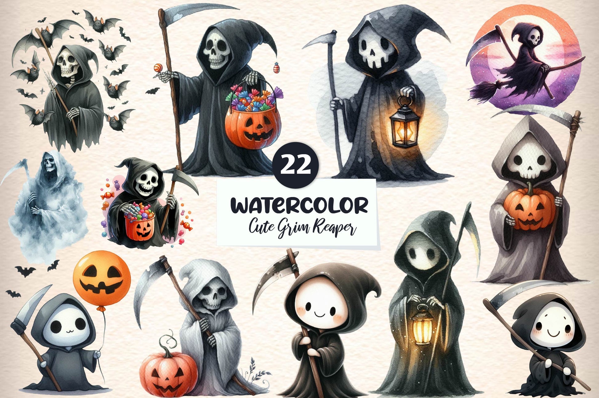 Reap with this Cute Grim Reaper Clipart Bundle, featuring adorable death designs, ideal for kawaii Halloween crafts.