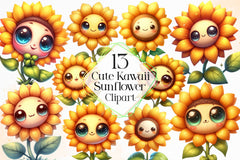 Shine with this Cute Kawaii Sunflower Clipart Bundle, featuring adorable flower designs, perfect for sweet garden crafts.