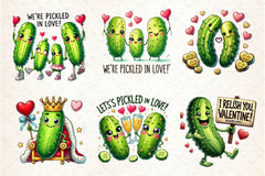 Adorable pickle characters celebrating Valentine's Day for quirky food projects.